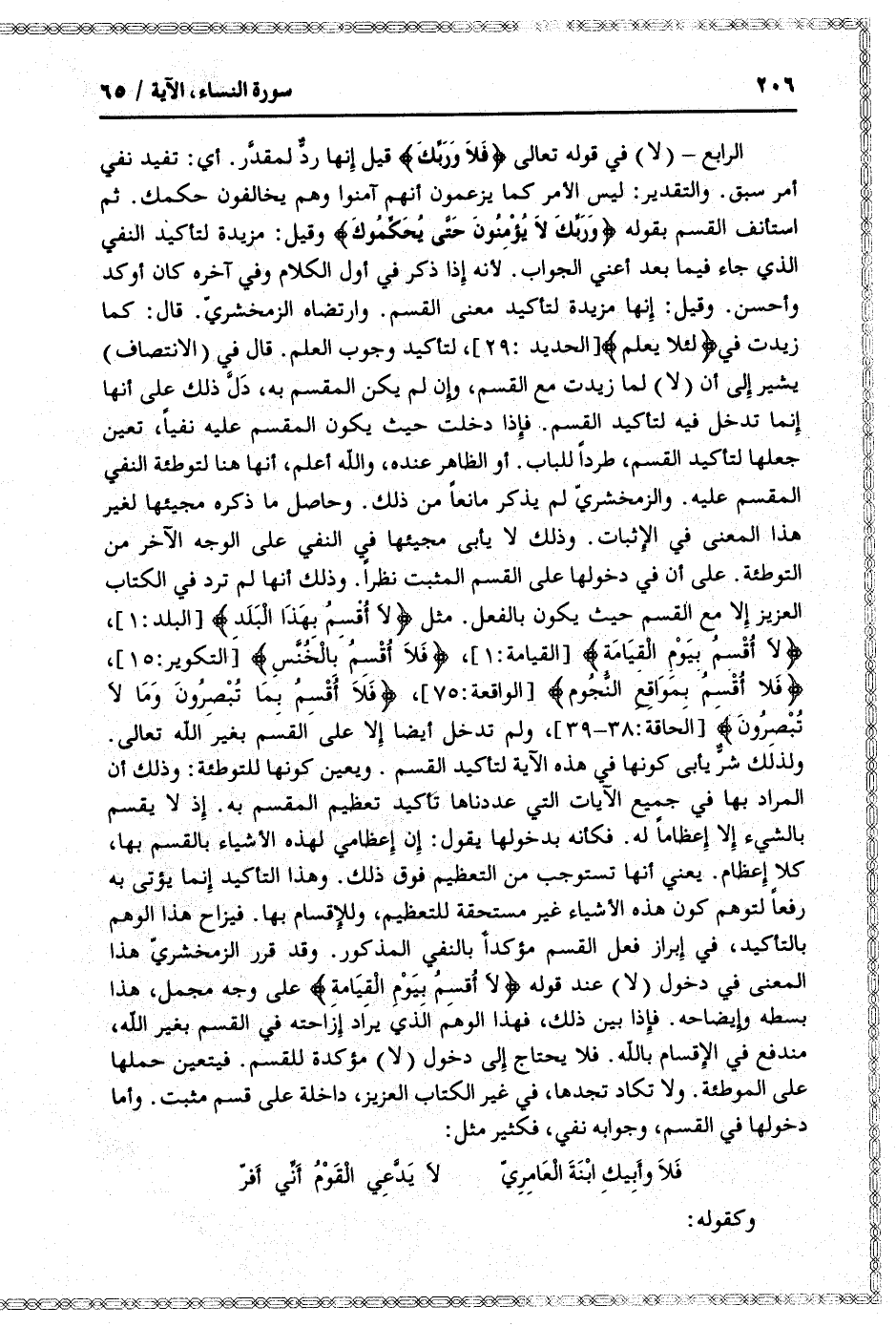 الرابع- (لا) في قوله تعالى فَلا وَرَبِّكَ قيل إنها ردّ لمقدّر. أي: تفيد نفي أمر سبق. والتقدير: ليس الأمر كما يزعمون أنهم آمنوا وهم يخالفون حكمك. ثم استأنف القسم بقوله وَرَبِّكَ لا يُؤْمِنُونَ حَتَّى يُحَكِّمُوكَ وقيل: مزيدة لتأكيد النفي الذي جاء فيما بعد أعني الجواب. لأنه إذا ذكر في أول الكلام وفي آخره كان أوكد وأحسن. وقيل: إنها مزيدة لتأكيد معنى القسم. وارتضاه الزمخشريّ. قال: كما زيدت في لِئَلَّا يَعْلَمَ [الحديد: 29] ، لتأكيد وجوب العلم. قال في (الانتصاف) يشير إلى أن (لا) لما زيدت مع القسم، وإن لم يكن المقسم به، دلّ ذلك على أنها إنما تدخل فيه لتأكيد القسم. فإذا دخلت حيث يكون المقسم عليه نفيا، تعين جعلها لتأكيد القسم، طردا للباب. أو الظاهر عنده، والله أعلم، أنها هنا لتوطئة النفي المقسم عليه. والزمخشريّ لم يذكر مانعا من ذلك. وحاصل ما ذكره مجيئها لغير هذا المعنى في الإثبات. وذلك لا يأبى مجيئها في النفي على الوجه الآخر من التوطئة. على أن في دخولها على القسم المثبت نظرا. وذلك أنها لم ترد في الكتاب العزيز إلا مع القسم حيث يكون بالفعل. مثل لا أُقْسِمُ بِهذَا الْبَلَدِ [البلد: 1] ، لا أُقْسِمُ بِيَوْمِ الْقِيامَةِ [القيامة: 1] ، فَلا أُقْسِمُ بِالْخُنَّسِ [التكوير: 15] ، فَلا أُقْسِمُ بِمَواقِعِ النُّجُومِ [الواقعة: 75] ، فَلا أُقْسِمُ بِما تُبْصِرُونَ وَما لا تُبْصِرُونَ [الحاقة: 38- 39] ، ولم تدخل أيضا إلا على القسم بغير الله تعالى.