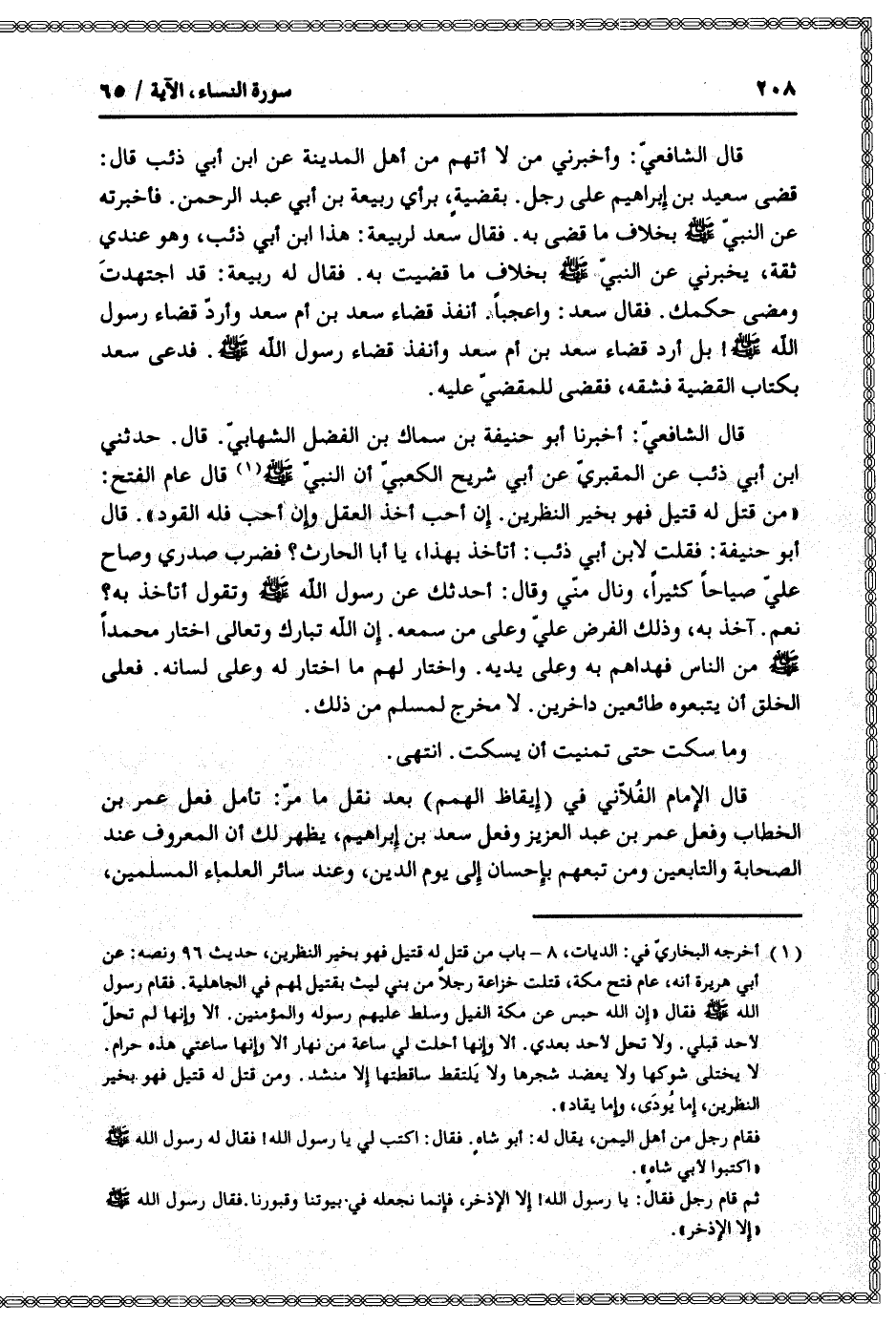 قال الشافعيّ: أخبرنا أبو حنيفة بن سماك بن الفضل الشهابيّ. قال. حدثني ابن أبي ذئب عن المقبريّ عن أبي شريح الكعبيّ أن النبيّ صلى الله عليه وسلم «1» قال عام الفتح: «من قتل له قتيل فهو بخير النظرين. إن أحب أخذ العقل وإن أحب فله القود» .