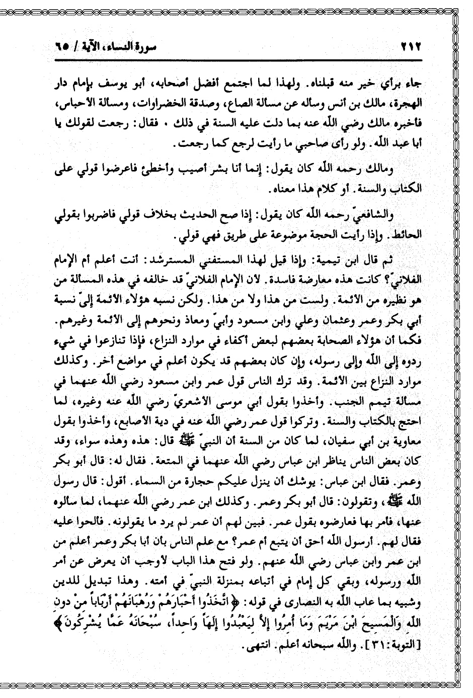 فكما أن هؤلاء الصحابة بعضهم لبعض أكفاء في موارد النزاع، فإذا تنازعوا في شيء ردوه إلى الله وإلى رسوله، وإن كان بعضهم قد يكون أعلم في مواضع أخر. وكذلك موارد النزاع بين الأئمة. وقد ترك الناس قول عمر وابن مسعود رضي الله عنهما في مسألة تيمم الجنب. وأخذوا بقول أبي موسى الأشعريّ رضي الله عنه وغيره، لما احتج بالكتاب والسنة. وتركوا قول عمر رضي الله عنه في دية الأصابع، وأخذوا بقول معاوية بن أبي سفيان، لما كان من السنة أن النبيّ صلى الله عليه وسلم قال: هذه وهذه سواء، وقد كان بعض الناس يناظر ابن عباس رضي الله عنهما في المتعة. فقال له: قال أبو بكر وعمر. فقال ابن عباس: يوشك أن ينزل عليكم حجارة من السماء. أقول: قال رسول الله صلى الله عليه وسلم، وتقولون: قال أبو بكر وعمر. وكذلك ابن عمر رضي الله عنهما، لما سألوه عنها، فأمر بها فعارضوه بقول عمر. فبين لهم أن عمر لم يرد ما يقولونه. فألحوا عليه فقال لهم. أرسول الله أحق أن يتبع أم عمر؟ مع علم الناس بأن أبا بكر وعمر أعلم من ابن عمر وابن عباس رضي الله عنهم. ولو فتح هذا الباب لأوجب أن يعرض عن أمر الله ورسوله، وبقي كل إمام في أتباعه بمنزلة النبيّ في أمته. وهذا تبديل للدين وشبيه بما عاب الله به النصارى في قوله: اتَّخَذُوا أَحْبارَهُمْ وَرُهْبانَهُمْ أَرْباباً مِنْ دُونِ اللَّهِ وَالْمَسِيحَ ابْنَ مَرْيَمَ وَما أُمِرُوا إِلَّا لِيَعْبُدُوا إِلهاً واحِداً، لا إِلهَ إِلَّا هُوَ سُبْحانَهُ عَمَّا يُشْرِكُونَ [التوبة: 31] . والله سبحانه أعلم. انتهى.