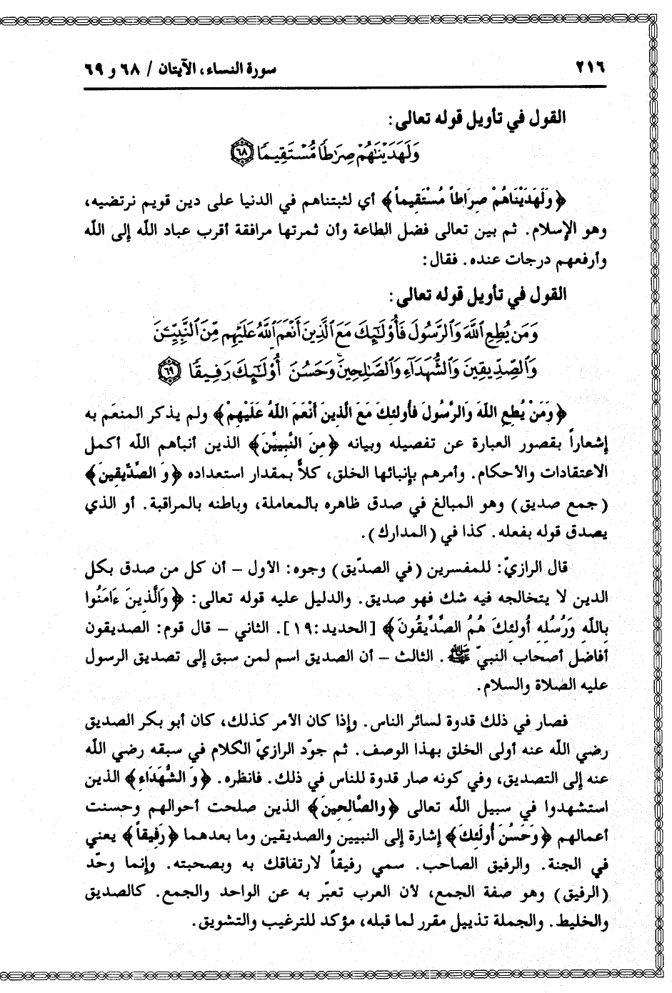 قال الرازيّ: للمفسرين (في الصدّيق) وجوه: الأول- أن كل من صدق بكل الدين لا يتخالجه فيه شك فهو صديق. والدليل عليه قوله تعالى: وَالَّذِينَ آمَنُوا بِاللَّهِ وَرُسُلِهِ أُولئِكَ هُمُ الصِّدِّيقُونَ [الحديد: 19] . الثاني- قال قوم: الصديقون أفاضل أصحاب النبيّ صلى الله عليه وسلم. الثالث- أن الصديق اسم لمن سبق إلى تصديق الرسول عليه الصلاة والسلام.