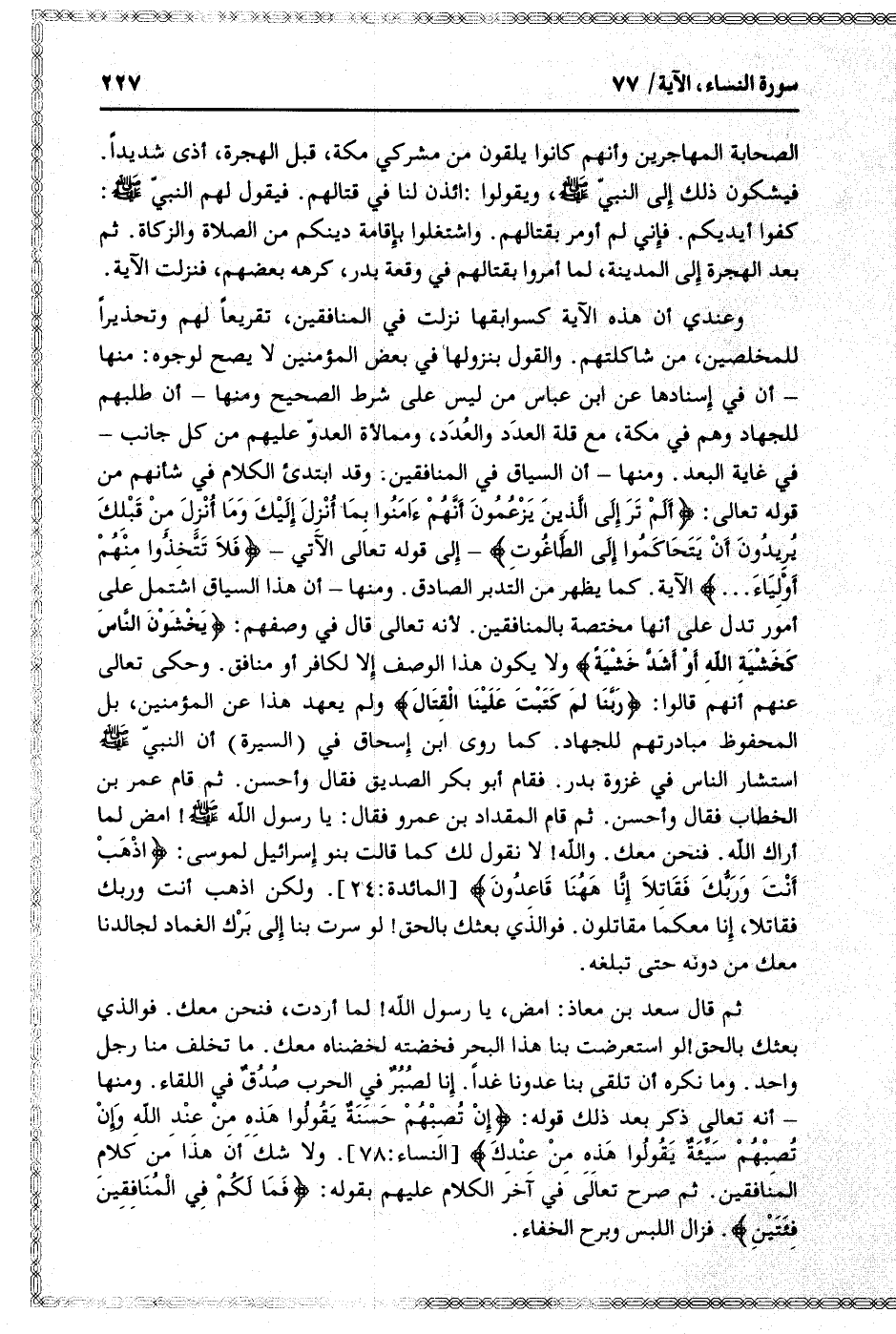 ثم قال سعد بن معاذ: امض، يا رسول الله! لما أردت، فنحن معك. فوالذي بعثك بالحق! لو استعرضت بنا هذا البحر فخضته لخضناه معك. ما تخلف منا رجل واحد. وما نكره أن تلقى بنا عدونا غدا. إنا لصبر في الحرب صدق في اللقاء. ومنها- أنه تعالى ذكر بعد ذلك قوله: إِنْ تُصِبْهُمْ حَسَنَةٌ يَقُولُوا هذِهِ مِنْ عِنْدِ اللَّهِ وَإِنْ تُصِبْهُمْ سَيِّئَةٌ يَقُولُوا هذِهِ مِنْ عِنْدِكَ [النساء: 78] . ولا شك أن هذا من كلام المنافقين. ثم صرح تعالى في آخر الكلام عليهم بقوله: فَما لَكُمْ فِي الْمُنافِقِينَ فِئَتَيْنِ. فزال اللبس وبرح الخفاء.