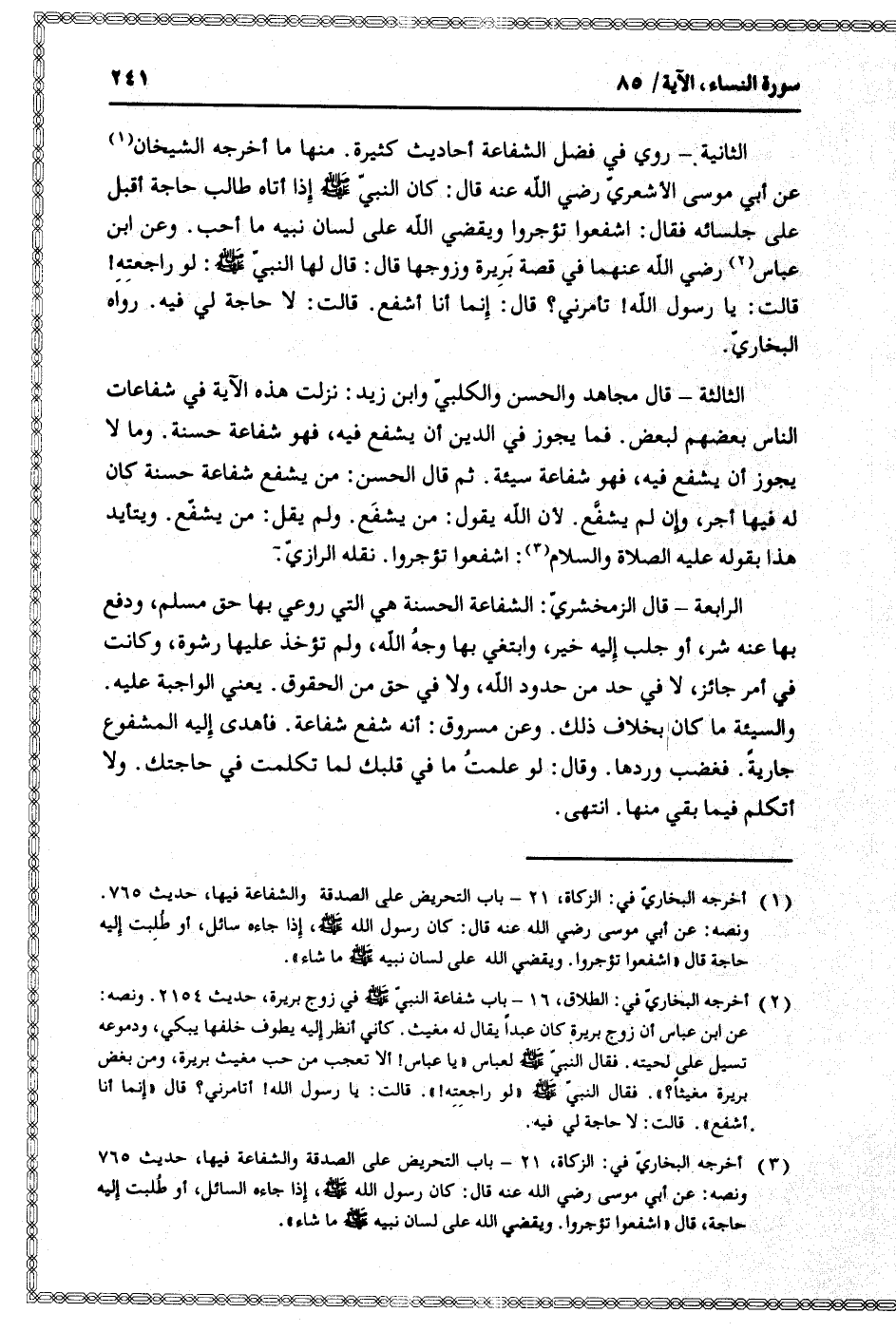 الرابعة- قال الزمخشريّ: الشفاعة الحسنة هي التي روعي بها حق مسلم، ودفع بها عنه شر، أو جلب إليه خير، وابتغي بها وجه الله، ولم تؤخذ عليها رشوة، وكانت في أمر جائز، لا في حد من حدود الله، ولا في حق من الحقوق. يعني الواجبة عليه.