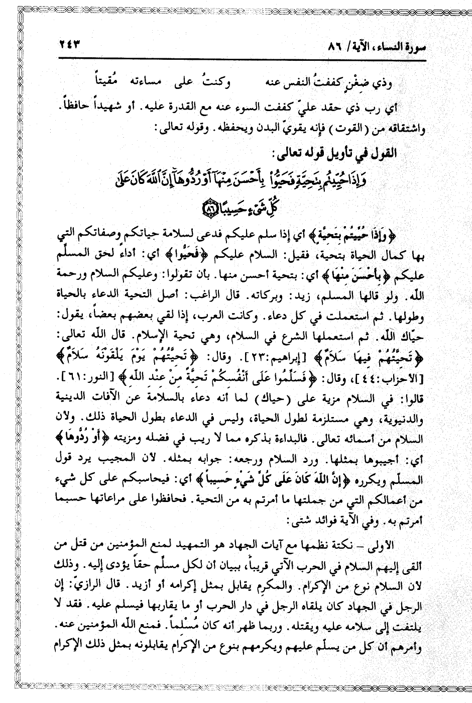 وَإِذا حُيِّيتُمْ بِتَحِيَّةٍ فَحَيُّوا بِأَحْسَنَ مِنْها أَوْ رُدُّوها إِنَّ اللَّهَ كانَ عَلى كُلِّ شَيْءٍ حَسِيباً (86)