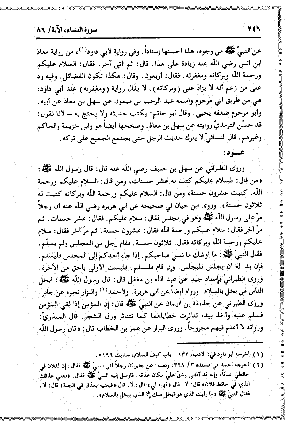 وروى ابن حيان في صحيحه عن أبي هريرة رضي الله عنه أن رجلا مرّ على رسول الله صلى الله عليه وسلم وهو في مجلس فقال: سلام عليكم. فقال: عشر حسنات. ثم مرّ آخر فقال: سلام عليكم ورحمة الله فقال: عشرون حسنة. ثم مرّ آخر فقال: سلام عليكم ورحمة الله وبركاته فقال: ثلاثون حسنة. فقام رجل من المجلس ولم يسلّم.