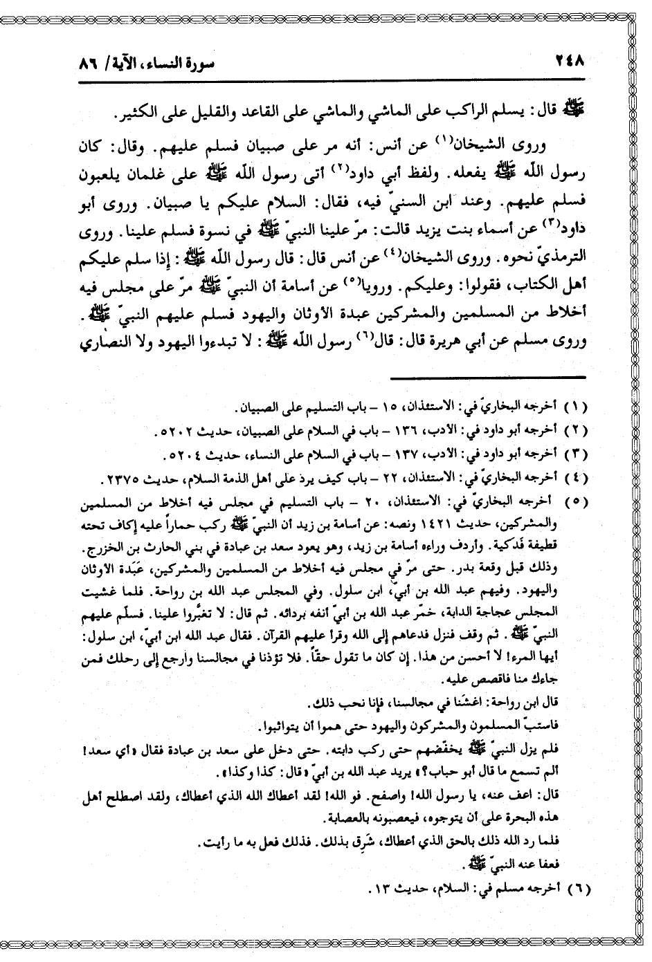 ورويا «5» عن أسامة أن النبيّ صلى الله عليه وسلم مرّ على مجلس فيه أخلاط من المسلمين والمشركين عبدة الأوثان واليهود فسلم عليهم النبيّ صلى الله عليه وسلم.
