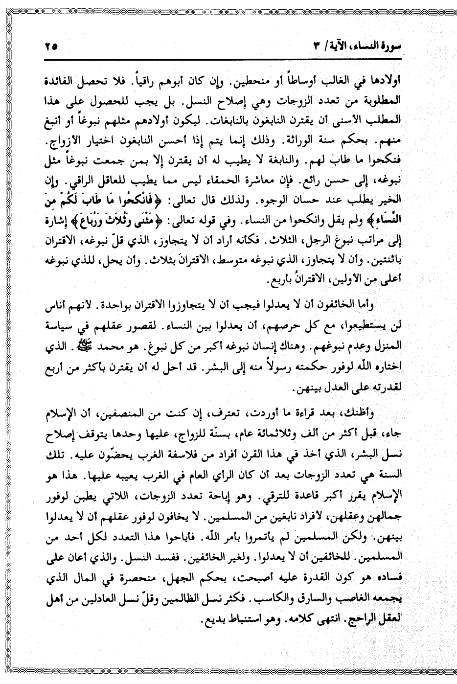 وأما الخائفون أن لا يعدلوا فيجب أن لا يتجاوزوا الاقتران بواحدة. لأنهم أناس لن يستطيعوا، مع كل حرصهم، أن يعدلوا بين النساء. لقصور عقلهم في سياسة المنزل وعدم نبوغهم. وهناك إنسان نبوغه أكبر من كل نبوغ. هو محمد صلى الله عليه وسلم. الذي اختاره الله لوفور حكمته رسولا منه إلى البشر. قد أحل له أن يقترن بأكثر من أربع لقدرته على العدل بينهن.