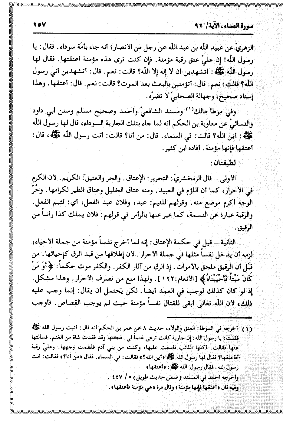 الزهريّ عن عبيد الله بن عبد الله عن رجل من الأنصار أنه جاء بأمة سوداء. فقال: يا رسول الله! إن عليّ عتق رقبة مؤمنة. فإن كنت ترى هذه مؤمنة أعتقتها. فقال لها رسول الله صلى الله عليه وسلم: أتشهدين أن لا إله إلا الله؟ قالت: نعم. قال: أتشهدين أني رسول الله؟ قالت: نعم. قال: أتؤمنين بالبعث بعد الموت؟ قالت: نعم. قال: أعتقها