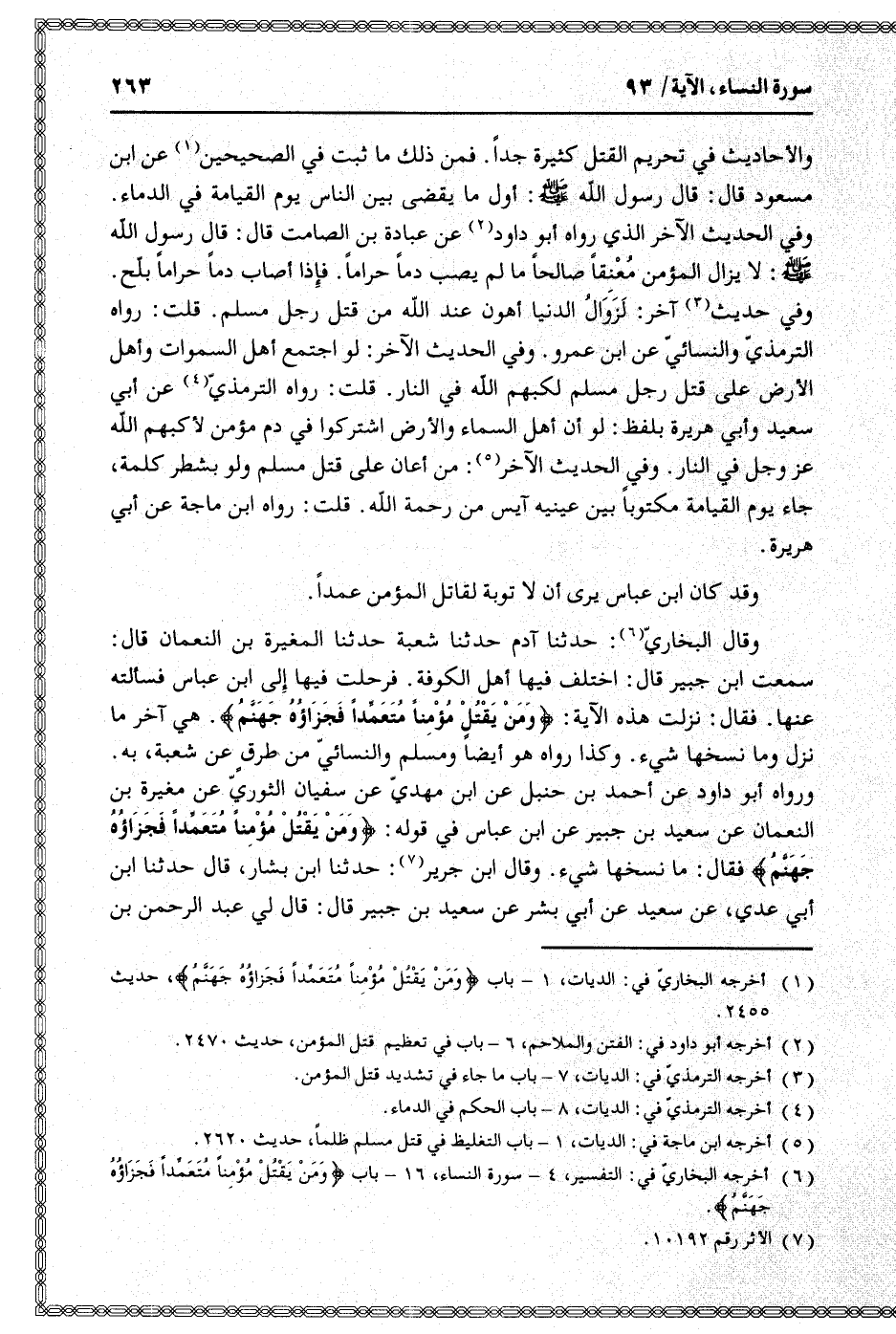 (6) أخرجه البخاريّ في: التفسير، 4- سورة النساء، 16- باب وَمَنْ يَقْتُلْ مُؤْمِناً مُتَعَمِّداً فَجَزاؤُهُ جَهَنَّمُ.