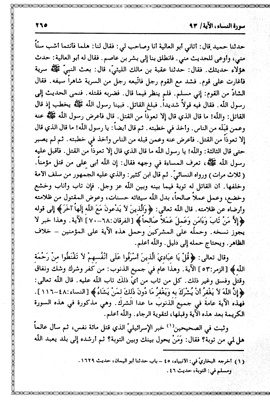 حدثنا حميد قال: أتاني أبو العالية أنا وصاحب لي: فقال لنا: هلما فأنتما أشب سنّا مني، وأوعى للحديث مني. فانطلق بنا إلى بشر بن عاصم. فقال له أبو العالية: حدث هؤلاء حديثك. فقال: حدثنا عقبة بن مالك الليثيّ، قال: بعث النبيّ صلى الله عليه وسلم سرية فأغارت على قوم. فشد مع القوم رجل فاتّبعه رجل من السرية شاهرا سيفه. فقال الشادّ من القوم: إني مسلم. فلم ينظر فيما قال. فضربه فقتله. فنمى الحديث إلى رسول الله. فقال فيه قولا شديدا. فبلغ القاتل. فبينا رسول الله صلى الله عليه وسلم يخطب إذ قال القاتل: والله! ما قال الذي قال إلا تعوذا من القتل. قال فأعرض رسول الله صلى الله عليه وسلم عنه وعمن قبله من الناس. وأخذ في خطبته. ثم قال أيضا: يا رسول الله! ما قال الذي قال إلا تعوذا من القتل. فأعرض عنه وعمن قبله من الناس وأخذ في خطبته. ثم لم يصبر حتى قال الثالثة: والله! يا رسول الله ما قال الذي قال إلا تعوذا من القتل. فأقبل عليه رسول الله صلى الله عليه وسلم، تعرف المساءة في وجهه فقال: إن الله أبى على من قتل مؤمنا.