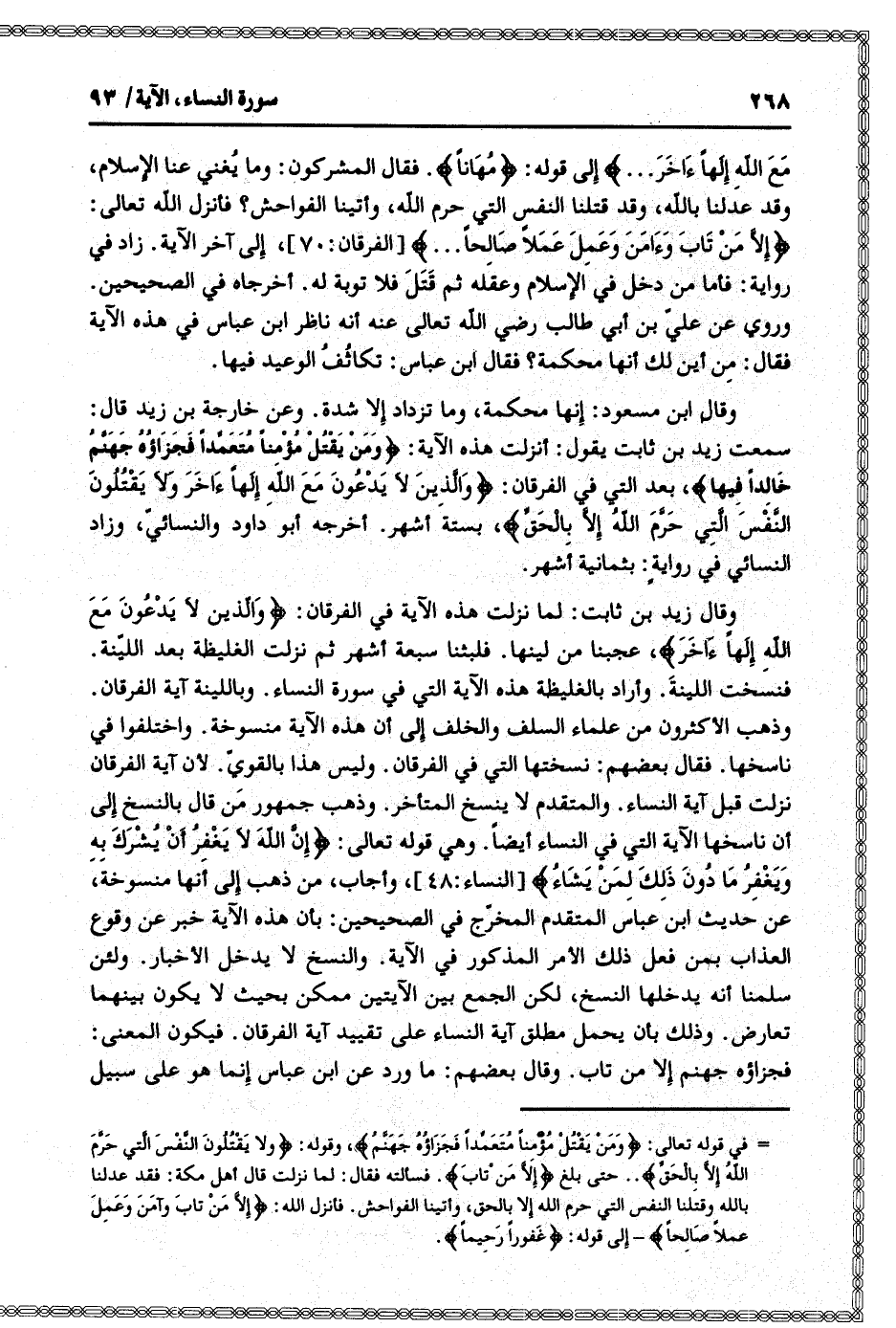 في قوله تعالى: وَمَنْ يَقْتُلْ مُؤْمِناً مُتَعَمِّداً فَجَزاؤُهُ جَهَنَّمُ، وقوله: وَلا يَقْتُلُونَ النَّفْسَ الَّتِي حَرَّمَ اللَّهُ إِلَّا بِالْحَقِّ.. حتى بلغ إِلَّا مَنْ تابَ. فسألته فقال: لما نزلت قال أهل مكة: فقد عدلنا بالله وقتلنا النفس التي حرم الله إلا بالحق، وأتينا الفواحش. فأنزل الله: إِلَّا مَنْ تابَ وَآمَنَ وَعَمِلَ عَمَلًا صالِحاً- إلى قوله: غَفُوراً رَحِيماً.