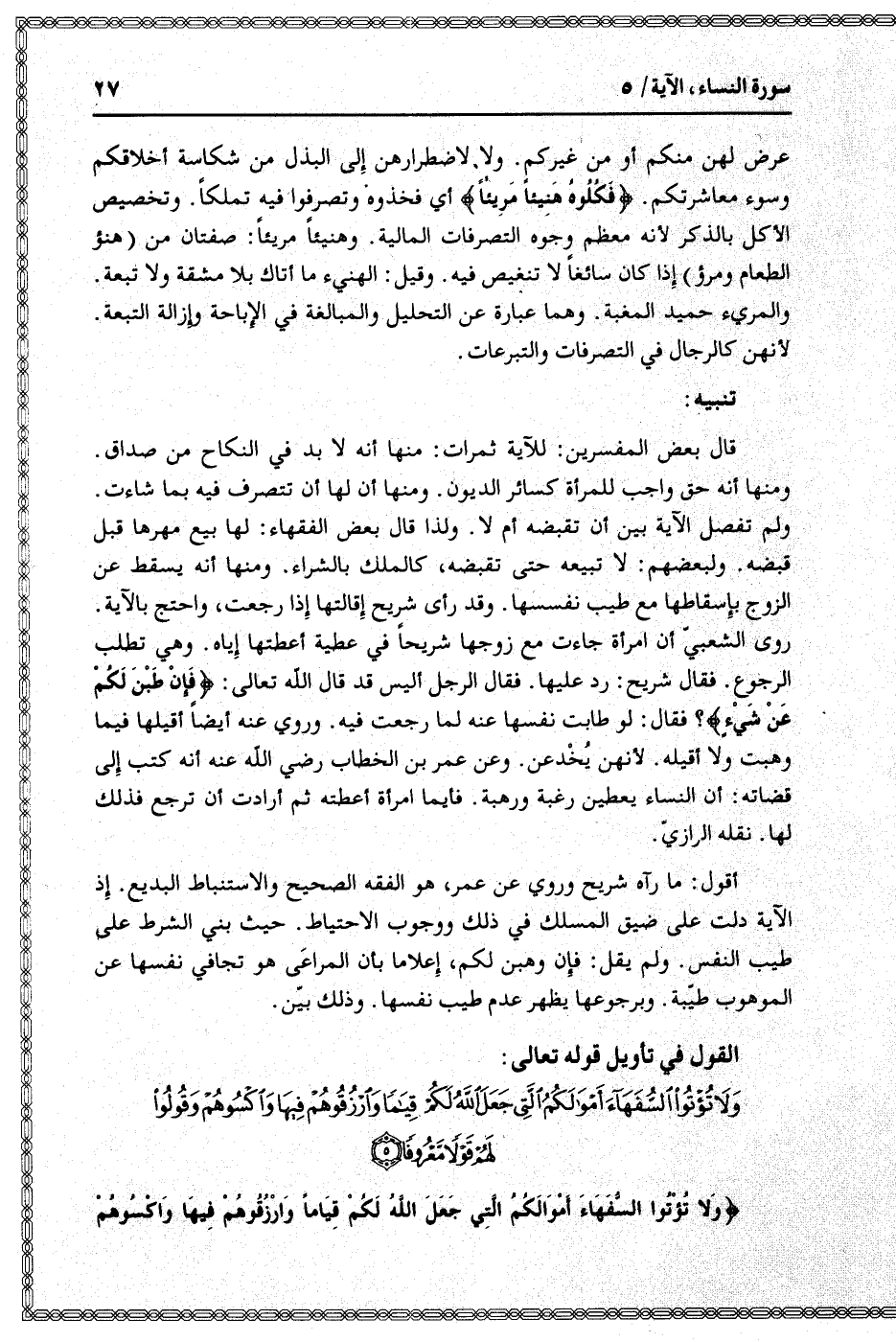 ولم تفصل الآية بين أن تقبضه أم لا. ولذا قال بعض الفقهاء: لها بيع مهرها قبل قبضه. ولبعضهم: لا تبيعه حتى تقبضه، كالملك بالشراء. ومنها أنه يسقط عن الزوج بإسقاطها مع طيب نفسها. وقد رأى شريح إقالتها إذا رجعت، واحتج بالآية.