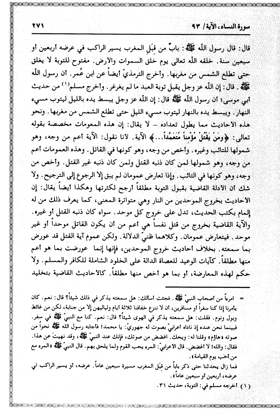 ونحو هذه الأحاديث مما يطول تعداده- لا يقال: إن هذه العمومات مخصصة بقوله تعالى: وَمَنْ يَقْتُلْ مُؤْمِناً مُتَعَمِّداً ... الآية. لأنا نقول: الآية أعم من وجه، وهو شمولها للتائب وغيره. وأخص من وجه، وهو كونها في القاتل. وهذه العمومات أعم من وجه، وهو شمولها لمن كان ذنبه القتل ولمن كان ذنبه غير القتل. وأخص من وجه، وهو كونها في التائب. وإذا تعارض عمومان لم يبق إلا الرجوع إلى الترجيح. ولا شك أن الأدلة القاضية بقبول التوبة مطلقا أرجح لكثرتها وهكذا أيضا يقال: إن الأحاديث بخروج الموحدين من النار وهي متواترة المعنى، كما يعرف ذلك من له إلمام بكتب الحديث، تدل على خروج كل موحد. سواء كان ذنبه القتل أو غيره.