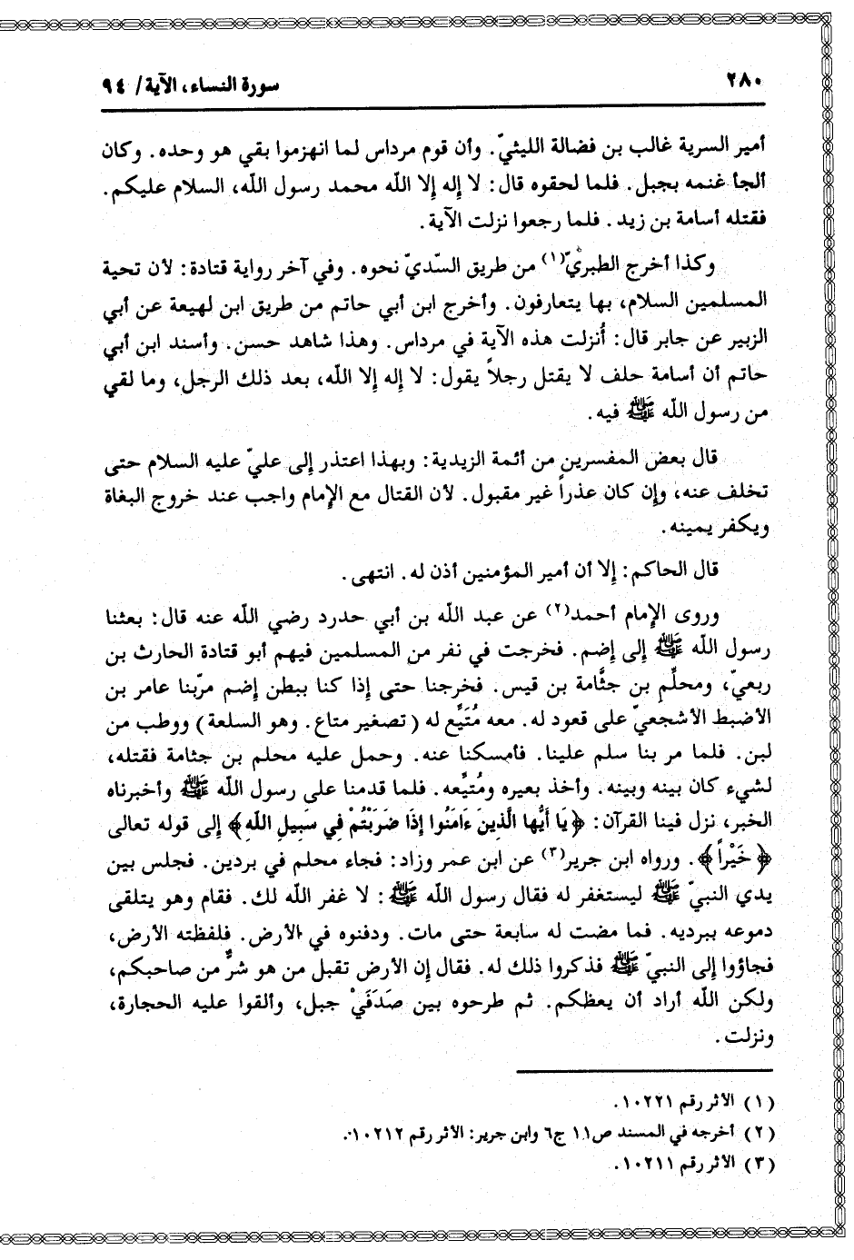 وروى الإمام أحمد «2» عن عبد الله بن أبي حدرد رضي الله عنه قال: بعثنا رسول الله صلى الله عليه وسلم إلى إضم. فخرجت في نفر من المسلمين فيهم أبو قتادة الحارث بن ربعيّ، ومحلّم بن جثّامة بن قيس. فخرجنا حتى إذا كنا ببطن إضم مرّ بنا عامر بن الأضبط الأشجعيّ على قعود له. معه متيّع له (تصغير متاع. وهو السلعة) ووطب من لبن. فلما مر بنا سلم علينا. فأمسكنا عنه. وحمل عليه محلم بن جثامة فقتله، لشيء كان بينه وبينه. وأخذ بعيره ومتيّعه. فلما قدمنا على رسول الله صلى الله عليه وسلم وأخبرناه الخبر، نزل فينا القرآن: يا أَيُّهَا الَّذِينَ آمَنُوا إِذا ضَرَبْتُمْ فِي سَبِيلِ اللَّهِ إلى قوله تعالى خَبِيراً.