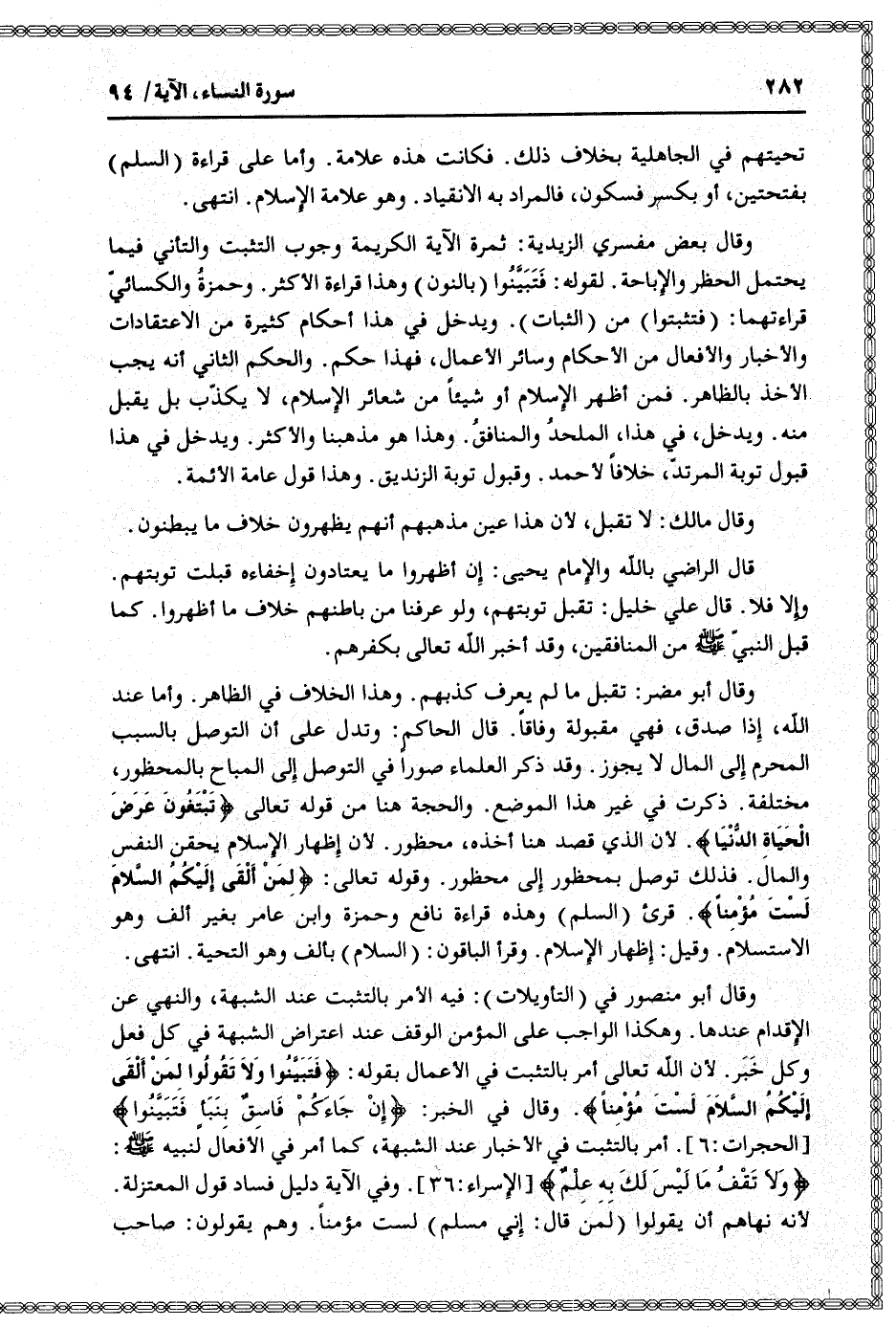 وقال أبو منصور في (التأويلات) : فيه الأمر بالتثبت عند الشبهة، والنهي عن الإقدام عندها. وهكذا الواجب على المؤمن الوقف عند اعتراض الشبهة في كل فعل وكل خبر. لأن الله تعالى أمر بالتثبت في الأعمال بقوله: فَتَبَيَّنُوا وَلا تَقُولُوا لِمَنْ أَلْقى إِلَيْكُمُ السَّلامَ لَسْتَ مُؤْمِناً. وقال في الخبر: إِنْ جاءَكُمْ فاسِقٌ بِنَبَإٍ فَتَبَيَّنُوا [الحجرات: 6] . أمر بالتثبت في الأخبار عند الشبهة، كما أمر في الأفعال لنبيه صلى الله عليه وسلم: