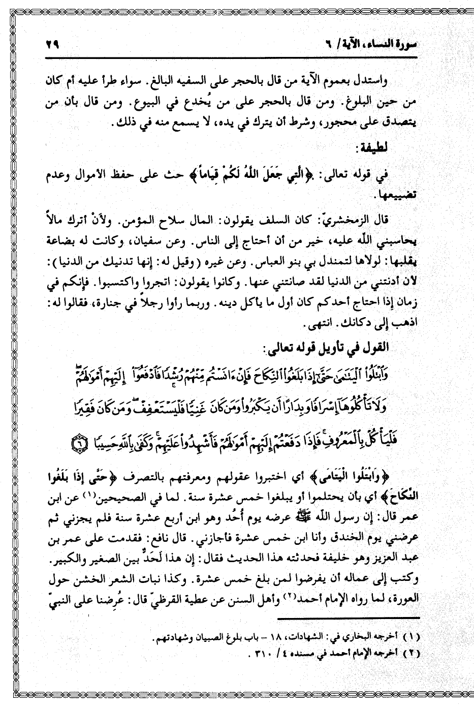 وَابْتَلُوا الْيَتامى حَتَّى إِذا بَلَغُوا النِّكاحَ فَإِنْ آنَسْتُمْ مِنْهُمْ رُشْداً فَادْفَعُوا إِلَيْهِمْ أَمْوالَهُمْ وَلا تَأْكُلُوها إِسْرافاً وَبِداراً أَنْ يَكْبَرُوا وَمَنْ كانَ غَنِيًّا فَلْيَسْتَعْفِفْ وَمَنْ كانَ فَقِيراً فَلْيَأْكُلْ بِالْمَعْرُوفِ فَإِذا دَفَعْتُمْ إِلَيْهِمْ أَمْوالَهُمْ فَأَشْهِدُوا عَلَيْهِمْ وَكَفى بِاللَّهِ حَسِيباً (6)