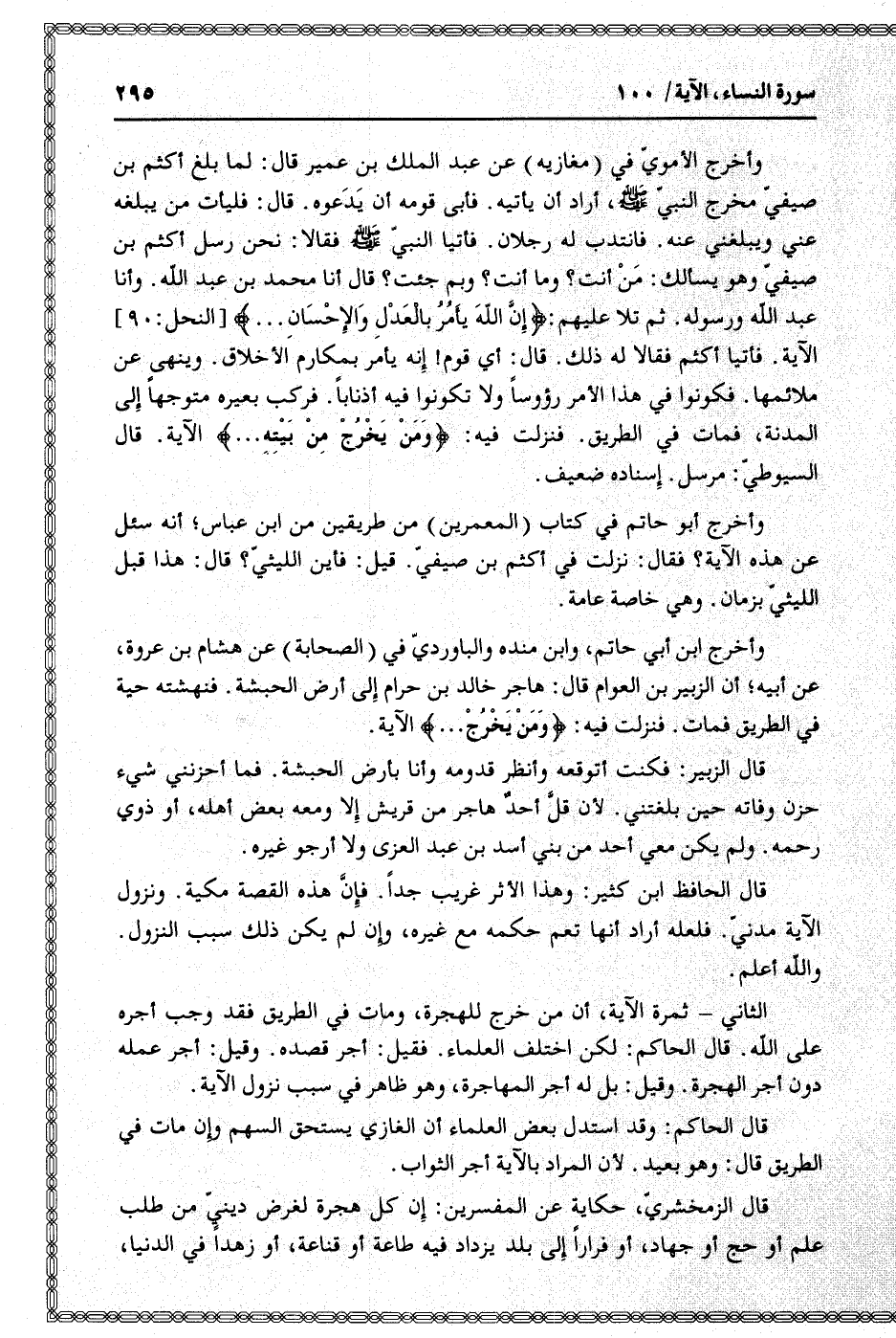 وأخرج الأمويّ في (مغازيه) عن عبد الملك بن عمير قال: لما بلغ أكثم بن صيفيّ مخرج النبيّ صلى الله عليه وسلم، أراد أن يأتيه. فأبى قومه أن يدعوه. قال: فليأت من يبلغه عني ويبلغني عنه. فانتدب له رجلان. فأتيا النبيّ صلى الله عليه وسلم فقالا: نحن رسل أكثم بن صيفيّ وهو يسألك: من أنت؟ وما أنت؟ وبم جئت؟ قال أنا محمد بن عبد الله. وأنا عبد الله ورسوله. ثم تلا عليهم: إِنَّ اللَّهَ يَأْمُرُ بِالْعَدْلِ وَالْإِحْسانِ ... [النحل: 90] الآية. فأتيا أكثم فقالا له ذلك. قال: أي قوم! إنه يأمر بمكارم الأخلاق. وينهى عن ملائمها. فكونوا في هذا الأمر رؤوسا ولا تكونوا فيه أذنابا. فركب بعيره متوجها إلى المدنة، فمات في الطريق. فنزلت فيه: وَمَنْ يَخْرُجْ مِنْ بَيْتِهِ ... الآية