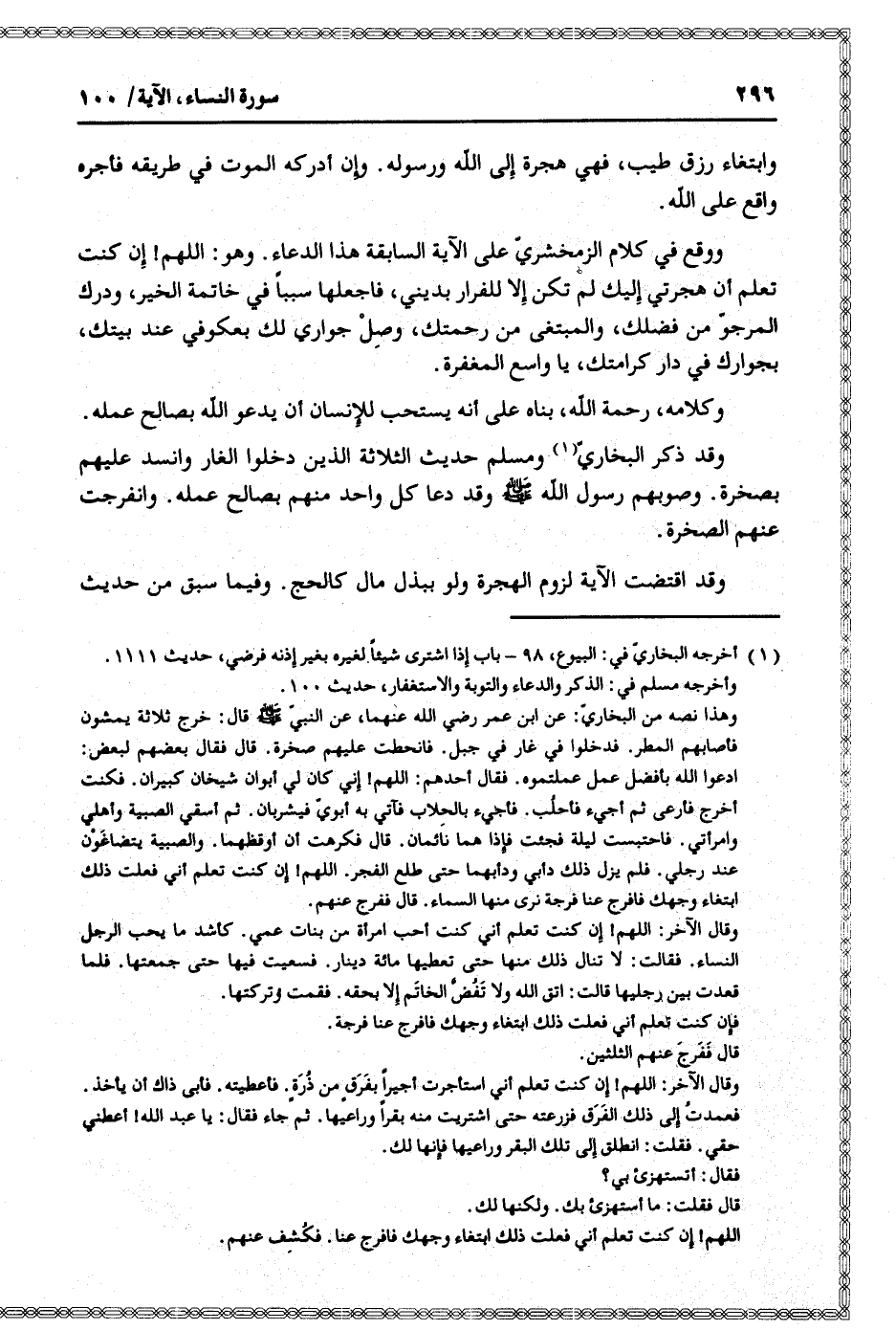 من البخاريّ: عن ابن عمر رضي الله عنهما، عن النبيّ صلى الله عليه وسلم قال: خرج ثلاثة يمشون فأصابهم المطر. فدخلوا في غار في جبل. فانحطت عليهم صخرة. قال فقال بعضهم لبعض: