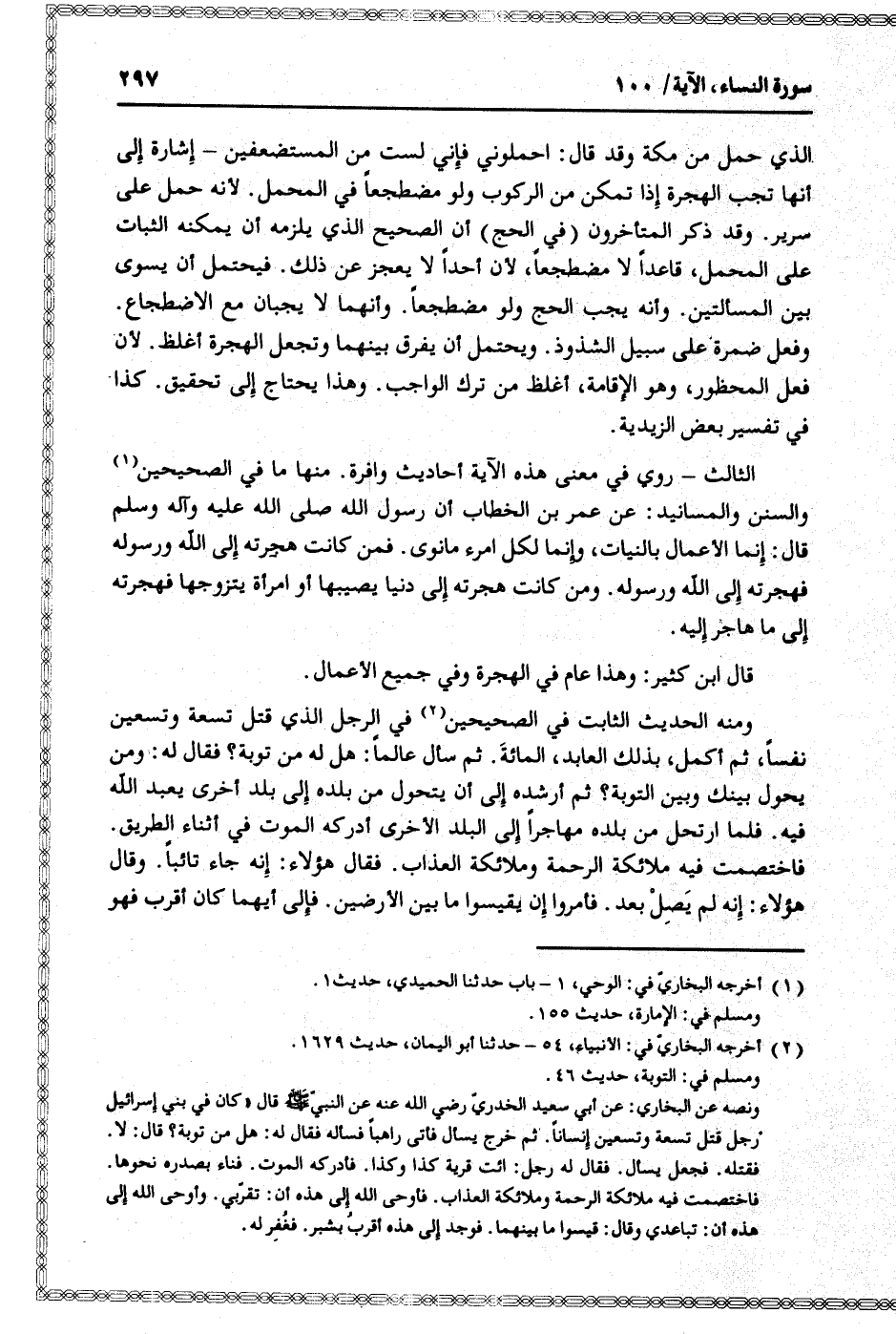 ومنه الحديث الثابت في الصحيحين «2» في الرجل الذي قتل تسعة وتسعين نفسا، ثم أكمل، بذلك العابد، المائة. ثم سأل عالما: هل له من توبة؟ فقال له: ومن يحول بينك وبين التوبة؟ ثم أرشده إلى أن يتحول من بلده إلى بلد أخرى يعبد الله فيه. فلما ارتحل من بلده مهاجرا إلى البلد الأخرى أدركه الموت في أثناء الطريق.
