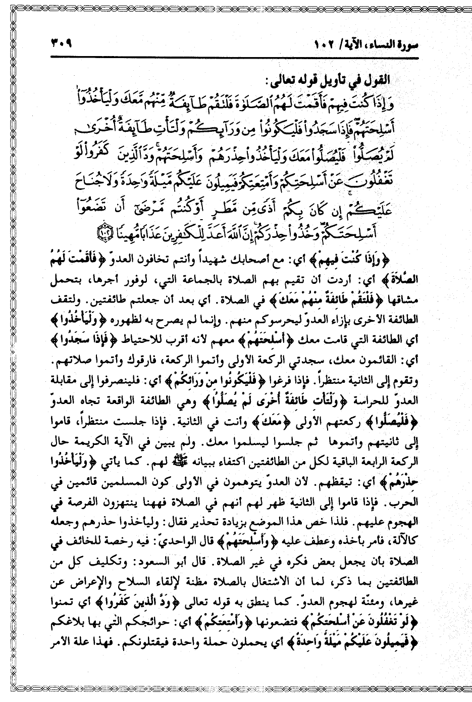 وَإِذا كُنْتَ فِيهِمْ فَأَقَمْتَ لَهُمُ الصَّلاةَ فَلْتَقُمْ طائِفَةٌ مِنْهُمْ مَعَكَ وَلْيَأْخُذُوا أَسْلِحَتَهُمْ فَإِذا سَجَدُوا فَلْيَكُونُوا مِنْ وَرائِكُمْ وَلْتَأْتِ طائِفَةٌ أُخْرى لَمْ يُصَلُّوا فَلْيُصَلُّوا مَعَكَ وَلْيَأْخُذُوا حِذْرَهُمْ وَأَسْلِحَتَهُمْ وَدَّ الَّذِينَ كَفَرُوا لَوْ تَغْفُلُونَ عَنْ أَسْلِحَتِكُمْ وَأَمْتِعَتِكُمْ فَيَمِيلُونَ عَلَيْكُمْ مَيْلَةً واحِدَةً وَلا جُناحَ عَلَيْكُمْ إِنْ كانَ بِكُمْ أَذىً مِنْ مَطَرٍ أَوْ كُنْتُمْ مَرْضى أَنْ تَضَعُوا أَسْلِحَتَكُمْ وَخُذُوا حِذْرَكُمْ إِنَّ اللَّهَ أَعَدَّ لِلْكافِرِينَ عَذاباً مُهِيناً (102)