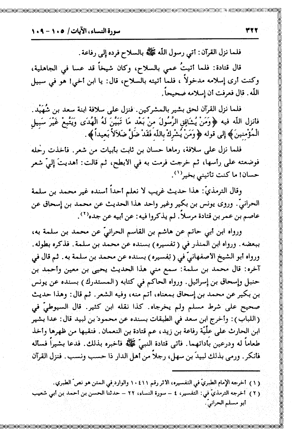 ورواه أبو الشيخ الأصفهانيّ في (تفسيره) بسنده عن محمد بن سلمة به. ثم قال في آخره: قال محمد بن سلمة: سمع مني هذا الحديث يحيى بن معين وأحمد بن حنبل وإسحاق بن إسرائيل. ورواه الحاكم في كتابه (المستدرك) بسنده عن يونس بن بكير عن محمد بن إسحاق بمعناه، أتم منه، وفيه الشعر. ثم قال: وهذا حديث صحيح على شرط مسلم ولم يخرجاه. كذا نقله ابن كثير. قال السيوطيّ في (اللباب) : وأخرج ابن سعد في الطبقات بسنده عن محمود بن لبيد قال: عدا بشير ابن الحارث على علّيّة رفاعة بن زيد، عم قتادة بن النعمان. فنقبها من ظهرها وأخذ طعاما له ودرعين بأداتهما. فأتى قتادة النبيّ صلى الله عليه وسلم فأخبره بذلك. فدعا بشيرا فسأله فأنكر. ورمى بذلك لبيد بن سهل، رجلا من أهل الدار ذا حسب ونسب. فنزل القرآن
