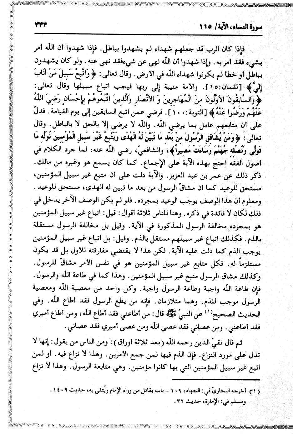 ثم قال تقيّ الدين رحمه الله (بعد ثلاثة أوراق) : ومن الناس من يقول: إنها لا تدل على مورد النزاع. فإن الذم فيها لمن جمع الأمرين. وهذا لا نزاع فيه. أو لمن اتبع غير سبيل المؤمنين التي بها كانوا مؤمنين. وهي متابعة الرسول. وهذا لا نزاع