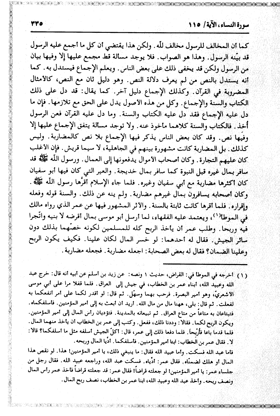 (1) أخرجه في الموطأ في: القراض، حديث 1 ونصه: عن زيد بن أسلم عن أبيه أنه قال: خرج عبد الله وعبيد الله، أبناء عمر بن الخطاب، في جيش إلى العراق. فلما قفلا مرا على أبي موسى الأشعريّ، وهو أمير البصرة. فرحب بهما وسهّل. ثم قال: لو أقدر لكما على أمر أنفعكما به لفعلت. ثم قال: بلى، هاهنا مال من مال الله. أريد أن أبعث به إلى أمير المؤمنين. فأسلفكماه.