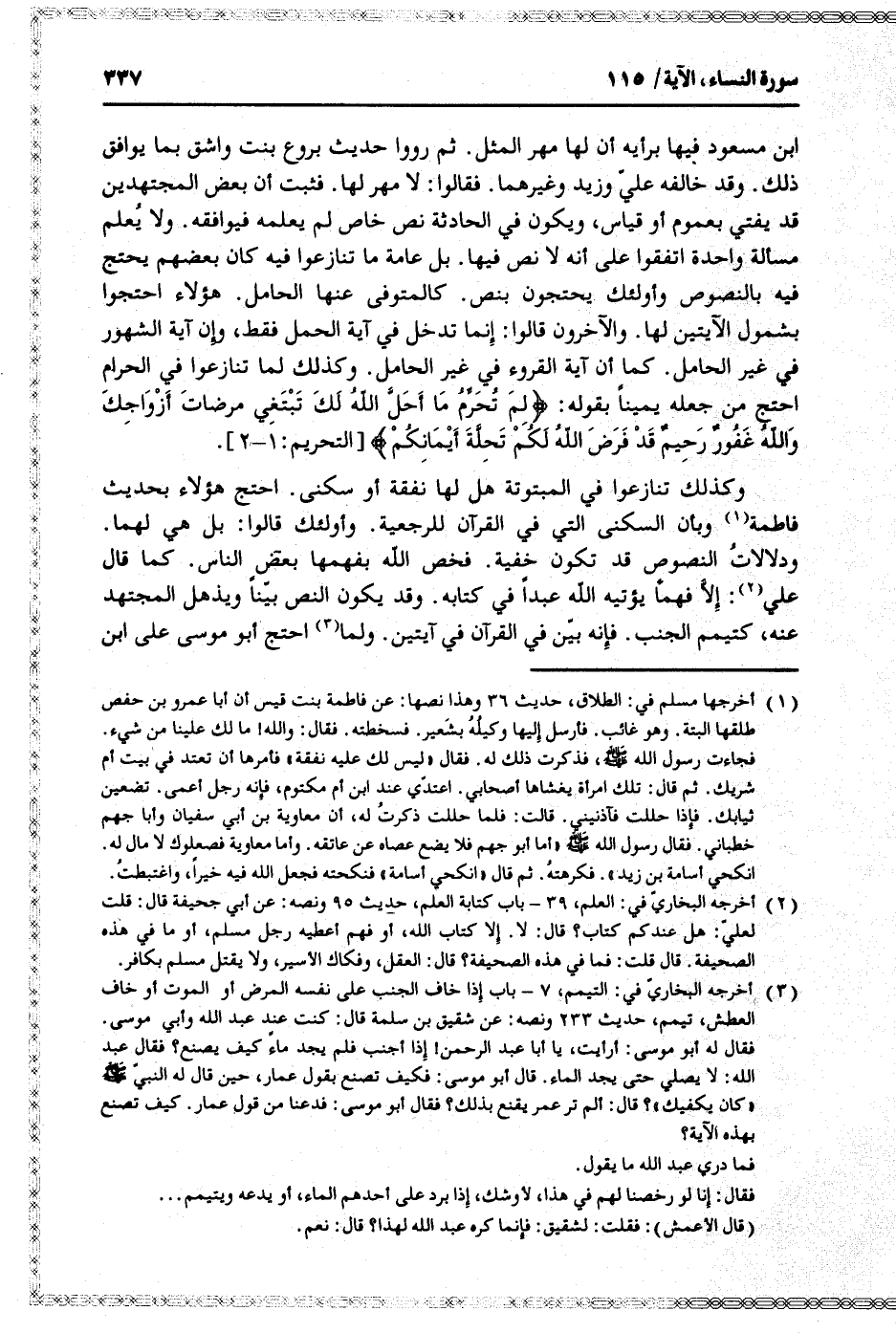 ابن مسعود فيها برأيه أن لها مهر المثل. ثم رووا حديث بروع بنت واشق بما يوافق ذلك. وقد خالفه عليّ وزيد وغيرهما. فقالوا: لا مهر لها. فثبت أن بعض المجتهدين قد يفتي بعموم أو قياس، ويكون في الحادثة نص خاص لم يعلمه فيوافقه. ولا يعلم مسألة واحدة اتفقوا على أنه لا نص فيها. بل عامة ما تنازعوا فيه كان بعضهم يحتج فيه بالنصوص وأولئك يحتجون بنص. كالمتوفى عنها الحامل. هؤلاء احتجوا بشمول الآيتين لها. والآخرون قالوا: إنما تدخل في آية الحمل فقط، وإن آية الشهور في غير الحامل. كما أن آية القروء في غير الحامل. وكذلك لما تنازعوا في الحرام احتج من جعله يمينا بقوله: لِمَ تُحَرِّمُ ما أَحَلَّ اللَّهُ لَكَ تَبْتَغِي مَرْضاتَ أَزْواجِكَ وَاللَّهُ غَفُورٌ رَحِيمٌ قَدْ فَرَضَ اللَّهُ لَكُمْ تَحِلَّةَ أَيْمانِكُمْ [التحريم: 1- 2] .