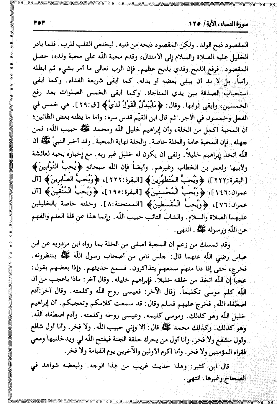 المقصود ذبح الولد. ولكن المقصود ذبحه من قلبه. ليخلص القلب للرب. فلما بادر الخليل عليه الصلاة والسلام إلى الامتثال، وقدم محبة الله على محبة ولده، حصل المقصود. فرفع الذبح وفدي بذبح عظيم. فإن الرب تعالى ما أمر بشيء ثم أبطله رأسا. بل لا بد أن يبقى بعضه أو بدله. كما أبقى شريعة الفداء. وكما أبقى استحباب الصدقة بين يدي المناجاة. وكما أبقى الخمس الصلوات بعد رفع الخمسين، وأبقى ثوابها. وقال: ما يُبَدَّلُ الْقَوْلُ لَدَيَّ [ق: 29] . هي خمس في الفعل وخمسون في الأجر. ثم قال ابن القيّم قدس سره: وأما ما يظنه بعض الظانين أن المحبة أكمل من الخلة، وأن إبراهيم خليل الله ومحمد صلى الله عليه وسلم حبيب الله، فمن جهله. فإن المحبة عامة والخلة خاصة. والخلة نهاية المحبة. وقد أخبر النبيّ صلى الله عليه وسلم أن الله اتخذ إبراهيم خليلا. ونفى أن يكون له خليل غير ربه. مع إخباره بحبه لعائشة ولأبيها ولعمر بن الخطاب وغيرهم. وأيضا فإن الله سبحانه يُحِبُّ التَّوَّابِينَ [البقرة: 222] ، وَيُحِبُّ الْمُتَطَهِّرِينَ [البقرة: 222] ، ويُحِبُّ الصَّابِرِينَ [آل عمران: 146] ، ويُحِبُّ الْمُحْسِنِينَ [البقرة: 195] ، ويُحِبُّ الْمُتَّقِينَ [آل عمران: 76] ، ويُحِبُّ الْمُقْسِطِينَ [الممتحنة: 8] . وخلته خاصة بالخليلين عليهما الصلاة والسلام. والشاب التائب حبيب الله. وإنما هذا عن قلة العلم والفهم عن الله ورسوله صلى الله عليه وسلم. انتهى.