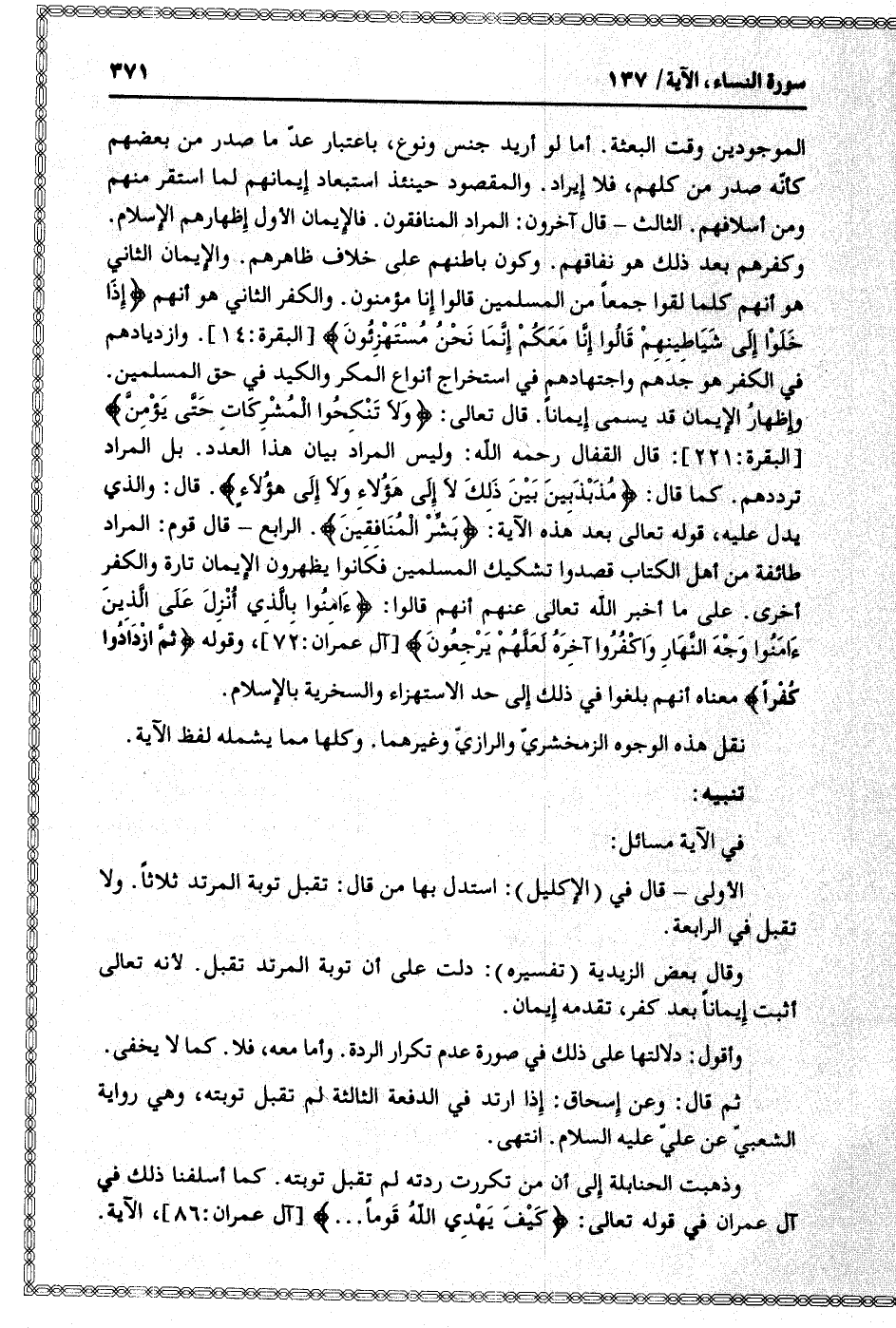 وقال بعض الزيدية (تفسيره) : دلت على أن توبة المرتد تقبل. لأنه تعالى أثبت إيمانا بعد كفر، تقدمه إيمان.
