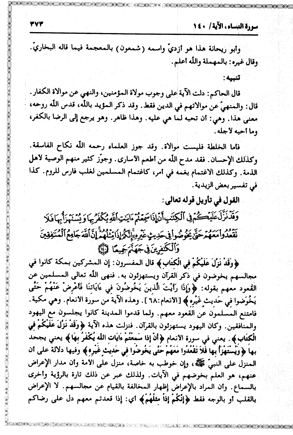 وَقَدْ نَزَّلَ عَلَيْكُمْ فِي الْكِتابِ أَنْ إِذا سَمِعْتُمْ آياتِ اللَّهِ يُكْفَرُ بِها وَيُسْتَهْزَأُ بِها فَلا تَقْعُدُوا مَعَهُمْ حَتَّى يَخُوضُوا فِي حَدِيثٍ غَيْرِهِ إِنَّكُمْ إِذاً مِثْلُهُمْ إِنَّ اللَّهَ جامِعُ الْمُنافِقِينَ وَالْكافِرِينَ فِي جَهَنَّمَ جَمِيعاً (140)