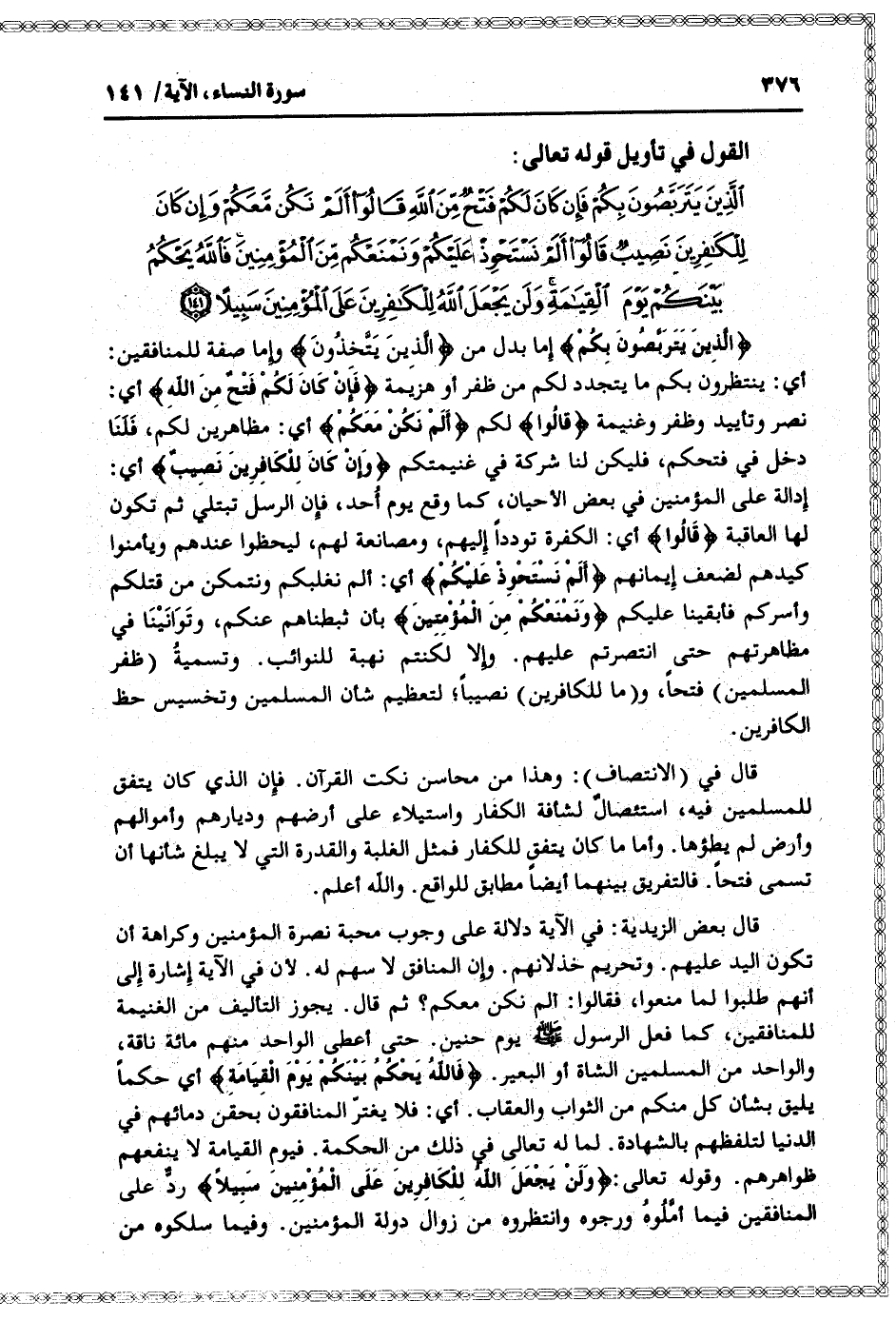 الَّذِينَ يَتَرَبَّصُونَ بِكُمْ فَإِنْ كانَ لَكُمْ فَتْحٌ مِنَ اللَّهِ قالُوا أَلَمْ نَكُنْ مَعَكُمْ وَإِنْ كانَ لِلْكافِرِينَ نَصِيبٌ قالُوا أَلَمْ نَسْتَحْوِذْ عَلَيْكُمْ وَنَمْنَعْكُمْ مِنَ الْمُؤْمِنِينَ فَاللَّهُ يَحْكُمُ بَيْنَكُمْ يَوْمَ الْقِيامَةِ وَلَنْ يَجْعَلَ اللَّهُ لِلْكافِرِينَ عَلَى الْمُؤْمِنِينَ سَبِيلاً (141)