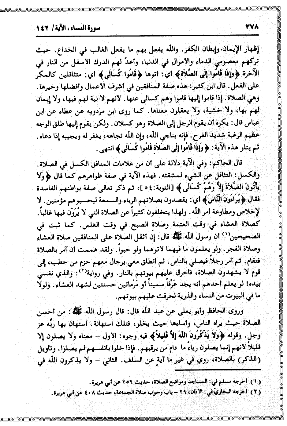 ثم يتلو هذه الآية: وَإِذا قامُوا إِلَى الصَّلاةِ قامُوا كُسالى