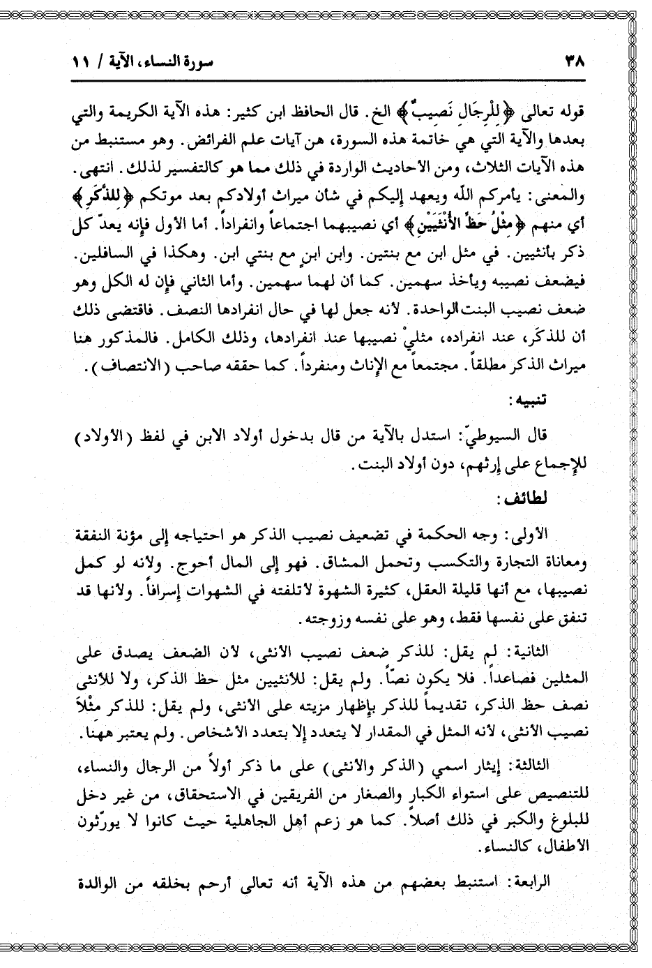 الأولى: وجه الحكمة في تضعيف نصيب الذكر هو احتياجه إلى مؤنة النفقة ومعاناة التجارة والتكسب وتحمل المشاق. فهو إلى المال أحوج. ولأنه لو كمل نصيبها، مع أنها قليلة العقل، كثيرة الشهوة لأتلفته في الشهوات إسرافا. ولأنها قد تنفق على نفسها فقط، وهو على نفسه وزوجته.