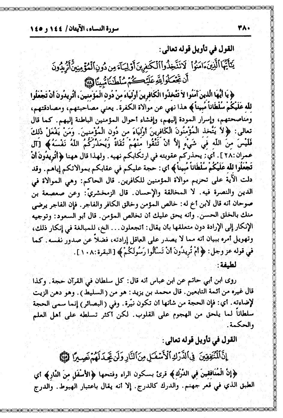 يا أَيُّهَا الَّذِينَ آمَنُوا لا تَتَّخِذُوا الْكافِرِينَ أَوْلِياءَ مِنْ دُونِ الْمُؤْمِنِينَ أَتُرِيدُونَ أَنْ تَجْعَلُوا لِلَّهِ عَلَيْكُمْ سُلْطاناً مُبِيناً (144)