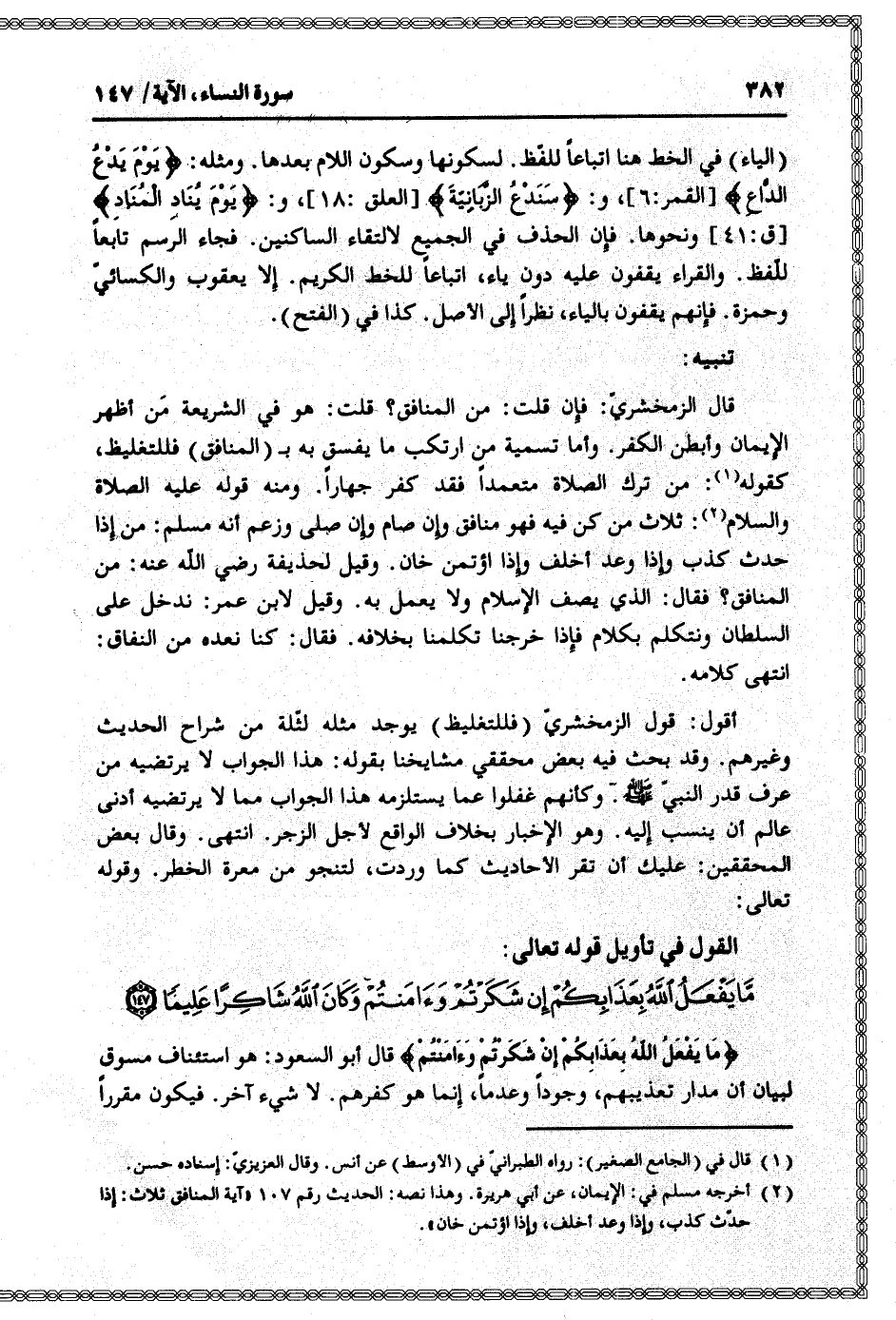 ومنه قوله عليه الصلاة والسلام «2» : ثلاث من كن فيه فهو منافق وإن صام وإن صلى وزعم أنه مسلم: من إذا حدث كذب وإذا وعد أخلف وإذا اؤتمن خان