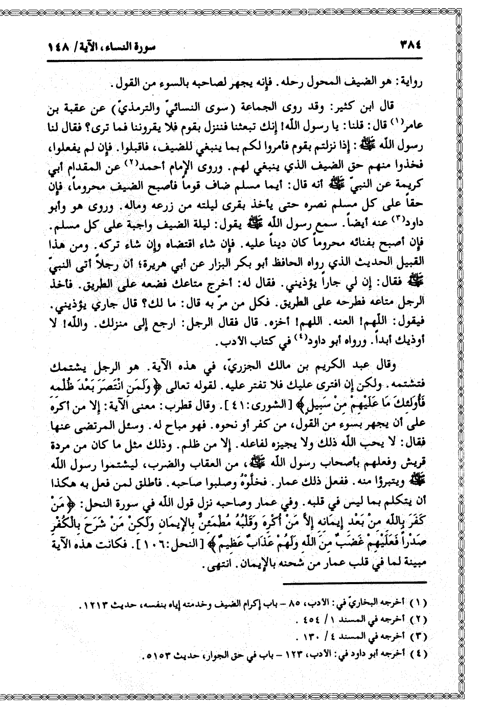 وقال عبد الكريم بن مالك الجزريّ، في هذه الآية. هو الرجل يشتمك فتشتمه. ولكن إن افترى عليك فلا تفتر عليه. لقوله تعالى وَلَمَنِ انْتَصَرَ بَعْدَ ظُلْمِهِ فَأُولئِكَ ما عَلَيْهِمْ مِنْ سَبِيلٍ [الشورى: 41] . وقال قطرب: معنى الآية: إلا من أكره على أن يجهر بسوء من القول، من كفر أو نحوه. فهو مباح له. وسئل المرتضى عنها فقال: لا يحب الله ذلك ولا يجيزه لفاعله. إلا من ظلم. وذلك مثل ما كان من مردة قريش وفعلهم بأصحاب رسول الله صلى الله عليه وسلم، من العقاب والضرب، ليشتموا رسول الله صلى الله عليه وسلم ويتبرءوا منه. ففعل ذلك عمار. فخلّوه وصلبوا صاحبه. فأطلق لمن فعل به هكذا أن يتكلم بما ليس في قلبه. وفي عمار وصاحبه نزل قول الله في سورة النحل: مَنْ كَفَرَ بِاللَّهِ مِنْ بَعْدِ إِيمانِهِ إِلَّا مَنْ أُكْرِهَ وَقَلْبُهُ مُطْمَئِنٌّ بِالْإِيمانِ وَلكِنْ مَنْ شَرَحَ بِالْكُفْرِ صَدْراً فَعَلَيْهِمْ غَضَبٌ مِنَ اللَّهِ وَلَهُمْ عَذابٌ عَظِيمٌ [النحل: 106] . فكانت هذه الآية مبينة لما في قلب عمار من شحنه بالإيمان. انتهى.
