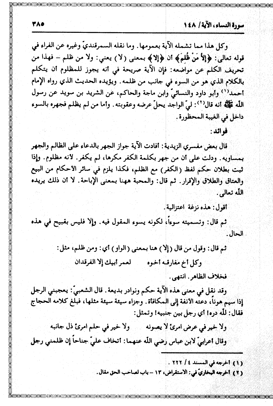 وكل هذا مما تشمله الآية بعمومها. وما نقله السمرقنديّ وغيره عن الفراء في قوله تعالى: إِلَّا مَنْ ظُلِمَ أن إِلَّا بمعنى (لا) يعني: ولا من ظلم- فهذا من تحريف الكلم عن مواضعه: فإن الآية صريحة في أنه يجوز للمظلوم أن يتكلم بالكلام الذي هو من السوء في جانب من ظلمه. ويؤيده