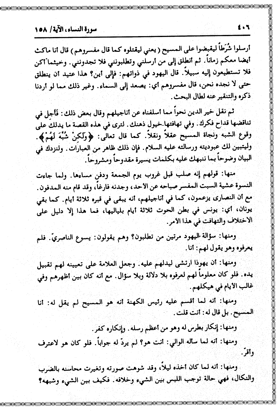 ثم نقل خير الدين نحوا مما أسلفناه عن أناجيلهم وقال بعض ذلك: فأجل في تناقضها قداح فكرك. وفي تهافتها خيول ذهنك. لترى في هذه القصة ما يدلك على وقوع الشبه ونجاة المسيح عقلا ونقلا. كما قال تعالى: وَلكِنْ شُبِّهَ لَهُمْ.