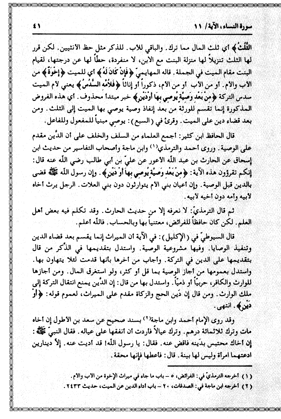 وقد روى الإمام أحمد وابن ماجة «2» بسند صحيح عن سعد بن الأطول إن أخاه مات وترك ثلاثمائة درهم. وترك عيالا فأردت أن أنفقها على عياله. فقال النبيّ صلى الله عليه وسلم: