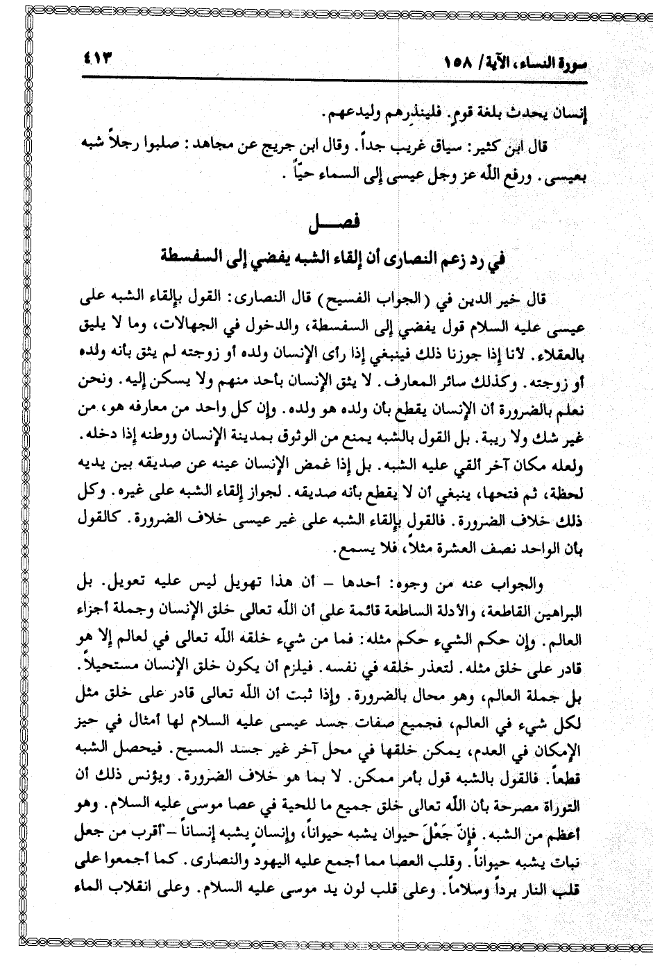 قال خير الدين في (الجواب الفسيح) قال النصارى: القول بإلقاء الشبه على عيسى عليه السلام قول يفضي إلى السفسطة، والدخول في الجهالات، وما لا يليق بالعقلاء. لأنا إذا جوزنا ذلك فينبغي إذا رأى الإنسان ولده أو زوجته لم يثق بأنه ولده أو زوجته. وكذلك سائر المعارف. لا يثق الإنسان بأحد منهم ولا يسكن إليه. ونحن نعلم بالضرورة أن الإنسان يقطع بأن ولده هو ولده. وإن كل واحد من معارفه هو، من غير شك ولا ريبة. بل القول بالشبه يمنع من الوثوق بمدينة الإنسان ووطنه إذا دخله.