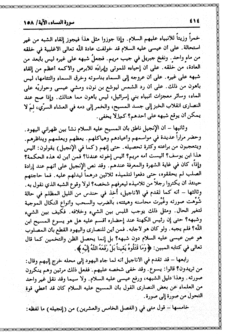 وإذا، كان في غاية الشهرة والمعرفة عندهم. وقد نص الإنجيل على أنهم عند إرادة الصلب لم يحققوه، حتى دفعوا لتلميذه ثلاثين درهما ليدلهم عليه. فما حاجتهم حينئذ أن يكتروا رجلا من تلاميذه ليعرفهم شخصه؟ لولا وقوع الشبه الذي نقول به.