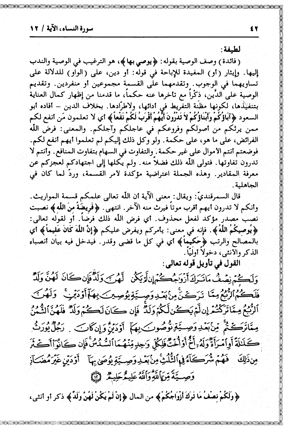 (فائدة) وصف الوصية بقوله: يُوصِي بِها، هو الترغيب في الوصية والندب إليها. وإيثار (أو) المفيدة للإباحة في قوله: أو دين، على (الواو) للدلالة على تساويهما في الوجوب. وتقدمهما على القسمة مجموعين أو منفردين. وتقديم الوصية على الدّين، ذكرا مع تأخرها عنه حكما، ما قدمنا من إظهار كمال العناية بتنفيذها، لكونها مظنة التفريط في أدائها، ولاطرّادها. بخلاف الدين- أفاده أبو السعود آباؤُكُمْ وَأَبْناؤُكُمْ لا تَدْرُونَ أَيُّهُمْ أَقْرَبُ لَكُمْ نَفْعاً أي لا تعلمون من أنفع لكم ممن يرثكم من أصولكم وفروعكم في عاجلكم وآجلكم. والمعنى: فرض الله الفرائض، على ما هو، على حكمة. ولو وكل ذلك إليكم لم تعلموا أيهم أنفع لكم.