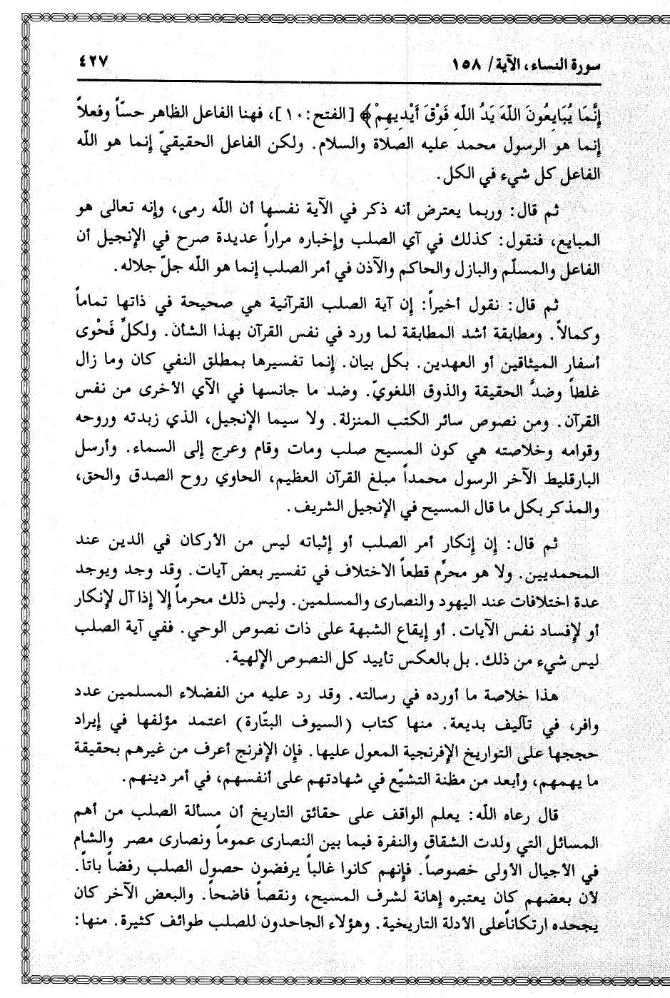 ثم قال: نقول أخيرا: إن آية الصلب القرآنية هي صحيحة في ذاتها تماما وكمالا. ومطابقة أشد المطابقة لما ورد في نفس القرآن بهذا الشأن. ولكلّ فحوى أسفار الميثاقين أو العهدين. بكل بيان. إنما تفسيرها بمطلق النفي كان وما زال غلطا وضدّ الحقيقة والذوق اللغويّ. وضد ما جانسها في الآي الأخرى من نفس القرآن. ومن نصوص سائر الكتب المنزلة. ولا سيما الإنجيل، الذي زبدته وروحه وقوامه وخلاصته هي كون المسيح صلب ومات وقام وعرج إلى السماء. وأرسل البارقليط الآخر الرسول محمدا مبلغ القرآن العظيم، الحاوي روح الصدق والحق، والمذكر بكل ما قال المسيح في الإنجيل الشريف.