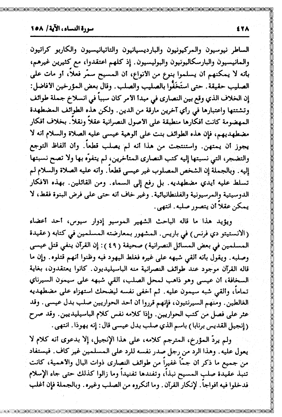 ولم يردّ المؤرخ، المترجم كلامه، على هذا الإنجيل، إلا بدعوى أنه كلام لا يعول عليه. وهذا الرد من رجل صدر نفسه للرد على المسلمين غير كاف. فيستفاد من جميع ما ذكر أن جمّا غفيرا من طوائف النصارى ذوات البال والأهمية، كانت تنبذ عقيدة صلب المسيح نبذا، وتفندها تفنيدا وما زالوا كذلك حتى جاء الإسلام فدخلوا فيه أفواجا. لإنكار القرآن. وما أنكروه من الصلب وغيره. وبالجملة فإن أغلب