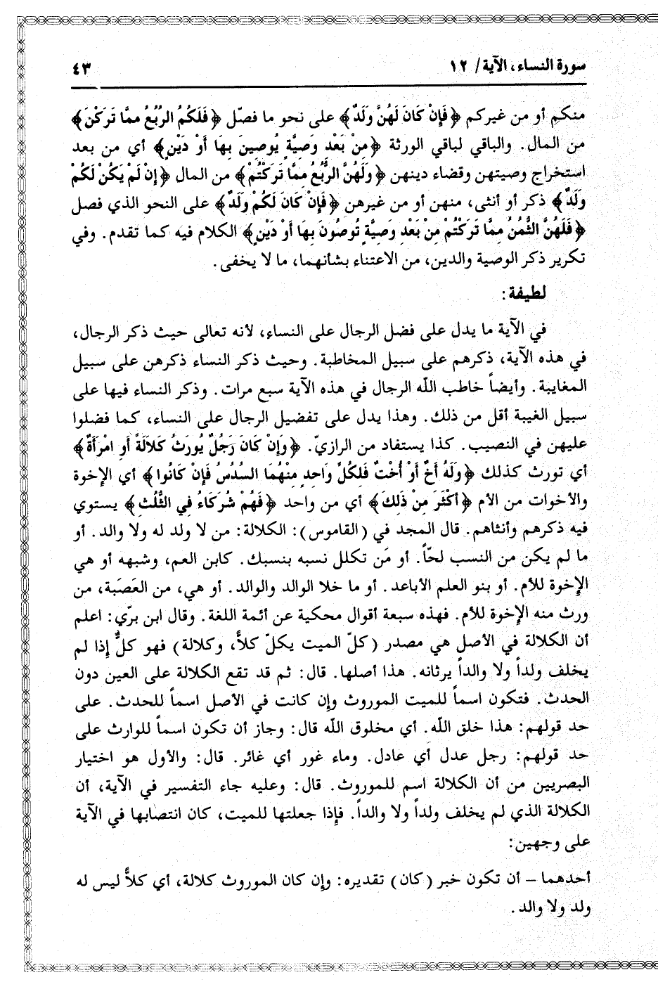 في الآية ما يدل على فضل الرجال على النساء، لأنه تعالى حيث ذكر الرجال، في هذه الآية، ذكرهم على سبيل المخاطبة. وحيث ذكر النساء ذكرهن على سبيل المغايبة. وأيضا خاطب الله الرجال في هذه الآية سبع مرات. وذكر النساء فيها على سبيل الغيبة أقل من ذلك. وهذا يدل على تفضيل الرجال على النساء، كما فضلوا عليهن في النصيب. كذا يستفاد من الرازيّ. وَإِنْ كانَ رَجُلٌ يُورَثُ كَلالَةً أَوِ امْرَأَةٌ أي تورث كذلك وَلَهُ أَخٌ أَوْ أُخْتٌ فَلِكُلِّ واحِدٍ مِنْهُمَا السُّدُسُ فَإِنْ كانُوا أي الإخوة والأخوات من الأم أَكْثَرَ مِنْ ذلِكَ أي من واحد فَهُمْ شُرَكاءُ فِي الثُّلُثِ يستوي فيه ذكرهم وأنثاهم. قال المجد في (القاموس) : الكلالة: من لا ولد له ولا والد. أو ما لم يكن من النسب لحّا. أو من تكلل نسبه بنسبك. كابن العم، وشبهه أو هي الإخوة للأم. أو بنو العلم الأباعد. أو ما خلا الوالد والوالد. أو هي، من العصبة، من ورث منه الإخوة للأم. فهذه سبعة أقوال محكية عن أئمة اللغة. وقال ابن برّي: اعلم أن الكلالة في الأصل هي مصدر (كلّ الميت يكلّ كلّا، وكلالة) فهو كلّ إذا لم يخلف ولدا ولا والدا يرثانه. هذا أصلها. قال: ثم قد تقع الكلالة على العين دون الحدث. فتكون اسما للميت الموروث وإن كانت في الأصل اسما للحدث. على حد قولهم: هذا خلق الله. أي مخلوق الله قال: وجاز أن تكون اسما للوارث على حد قولهم: رجل عدل أي عادل. وماء غور أي غائر. قال: والأول هو اختيار البصريين من أن الكلالة اسم للموروث. قال: وعليه جاء التفسير في الآية، أن الكلالة الذي لم يخلف ولدا ولا والدا. فإذا جعلتها للميت، كان انتصابها في الآية على وجهين: