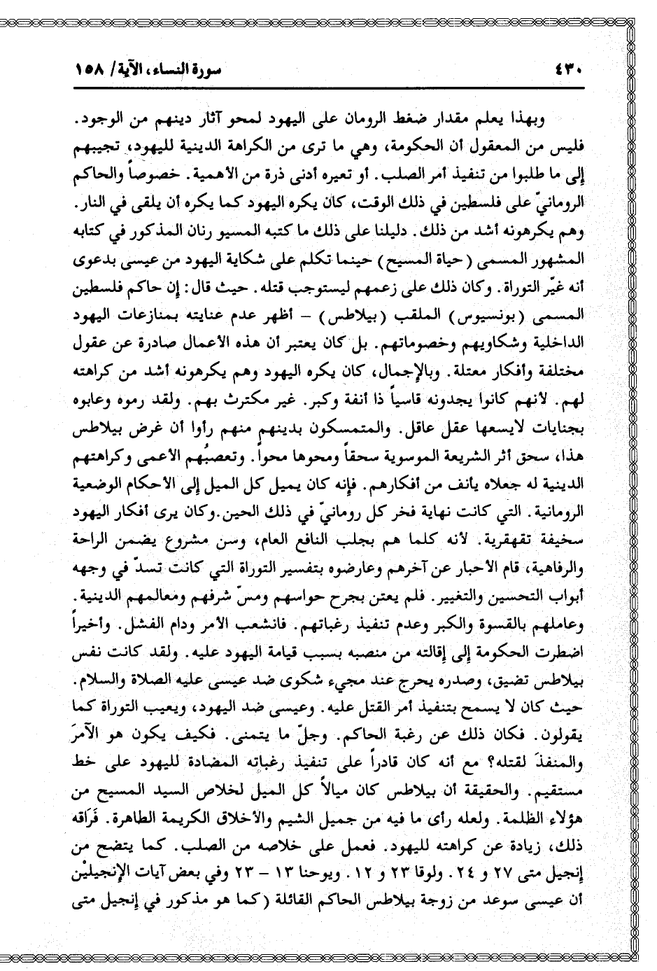 وهم يكرهونه أشد من ذلك. دليلنا على ذلك ما كتبه المسيو رنان المذكور في كتابه المشهور المسمى (حياة المسيح) حينما تكلم على شكاية اليهود من عيسى بدعوى أنه غيّر التوراة. وكان ذلك على زعمهم ليستوجب قتله. حيث قال: إن حاكم فلسطين المسمى (بونسيوس) الملقب (بيلاطس) - أظهر عدم عنايته بمنازعات اليهود الداخلية وشكاويهم وخصوماتهم. بل كان يعتبر أن هذه الأعمال صادرة عن عقول مختلفة وأفكار معتلة. وبالإجمال، كان يكره اليهود وهم يكرهونه أشد من كراهته لهم. لأنهم كانوا يجدونه قاسيا ذا أنفة وكبر. غير مكترث بهم. ولقد رموه وعابوه بجنايات لا يسعها عقل عاقل. والمتمسكون بدينهم منهم رأوا أن غرض بيلاطس هذا، سحق أثر الشريعة الموسوية سحقا ومحوها محوا. وتعصبهم الأعمى وكراهتهم الدينية له جعلاه يأنف من أفكارهم. فإنه كان يميل كل الميل إلى الأحكام الوضعية الرومانية. التي كانت نهاية فخر كل رومانيّ في ذلك الحين. وكان يرى أفكار اليهود سخيفة تقهقرية. لأنه كلما هم بجلب النافع العام، وسن مشروع يضمن الراحة والرفاهية، قام الأحبار عن آخرهم وعارضوه بتفسير التوراة التي كانت تسدّ في وجهه أبواب التحسين والتغيير. فلم يعتن بجرح حواسهم ومسّ شرفهم ومعالمهم الدينية.