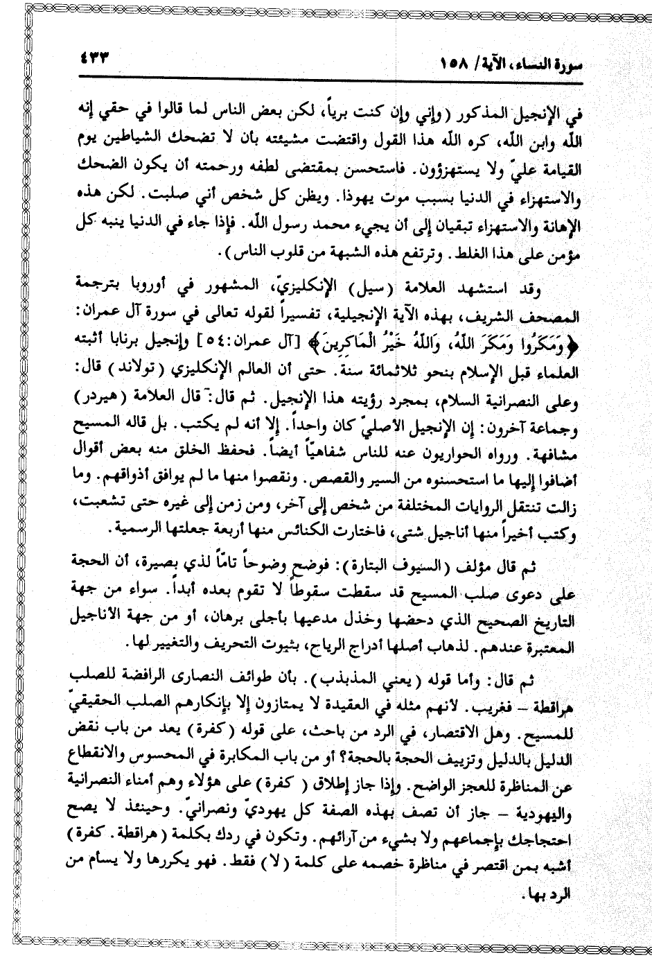 وقد استشهد العلامة (سيل) الإنكليزيّ، المشهور في أوروبا بترجمة المصحف الشريف، بهذه الآية الإنجيلية، تفسيرا لقوله تعالى في سورة آل عمران: