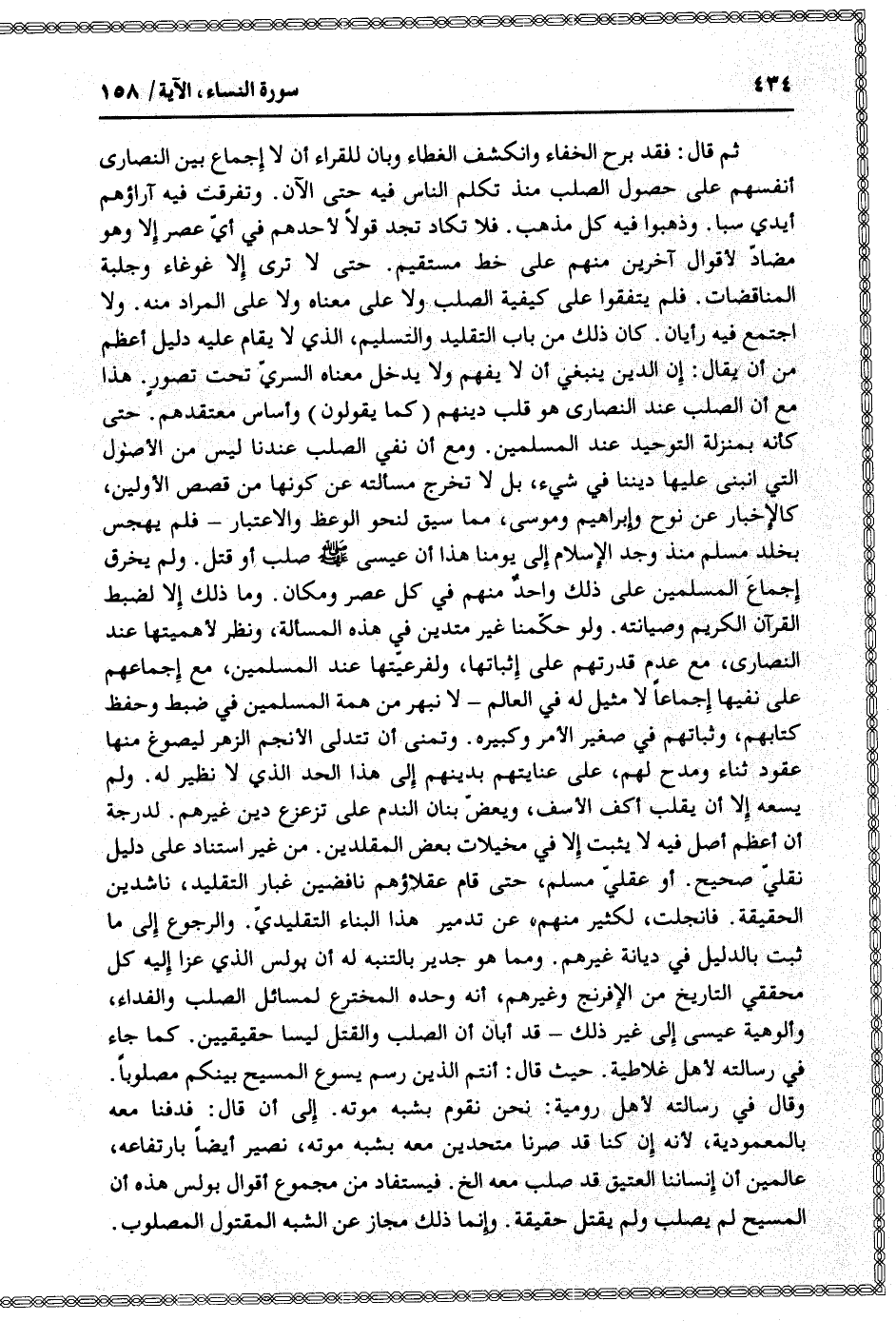 ثم قال: فقد برح الخفاء وانكشف الغطاء وبان للقراء أن لا إجماع بين النصارى أنفسهم على حصول الصلب منذ تكلم الناس فيه حتى الآن. وتفرقت فيه آراؤهم أيدي سبا. وذهبوا فيه كل مذهب. فلا تكاد تجد قولا لأحدهم في أيّ عصر إلا وهو مضادّ لأقوال آخرين منهم على خط مستقيم. حتى لا ترى إلا غوغاء وجلبة المناقضات. فلم يتفقوا على كيفية الصلب ولا على معناه ولا على المراد منه. ولا اجتمع فيه رأيان. كان ذلك من باب التقليد والتسليم، الذي لا يقام عليه دليل أعظم من أن يقال: إن الدين ينبغي أن لا يفهم ولا يدخل معناه السريّ تحت تصور. هذا مع أن الصلب عند النصارى هو قلب دينهم (كما يقولون) وأساس معتقدهم. حتى كأنه بمنزلة التوحيد عند المسلمين. ومع أن نفي الصلب عندنا ليس من الأصول التي انبنى عليها ديننا في شيء، بل لا تخرج مسألته عن كونها من قصص الأولين، كالإخبار عن نوح وإبراهيم وموسى، مما سيق لنحو الوعظ والاعتبار- فلم يهجس بخلد مسلم منذ وجد الإسلام إلى يومنا هذا أن عيسى صلى الله عليه وسلم صلب أو قتل. ولم يخرق إجماع المسلمين على ذلك واحد منهم في كل عصر ومكان. وما ذلك إلا لضبط القرآن الكريم وصيانته. ولو حكّمنا غير متدين في هذه المسألة، ونظر لأهمّيّتها عند النصارى، مع عدم قدرتهم على إثباتها، ولفرعيّتها عند المسلمين، مع إجماعهم على نفيها إجماعا لا مثيل له في العالم- لا نبهر من همة المسلمين في ضبط وحفظ كتابهم، وثباتهم في صغير الأمر وكبيره. وتمنى أن تتدلى الأنجم الزهر ليصوغ منها عقود ثناء ومدح لهم، على عنايتهم بدينهم إلى هذا الحد الذي لا نظير له. ولم يسعه إلا أن يقلب أكف الأسف، ويعضّ بنان الندم على تزعزع دين غيرهم. لدرجة أن أعظم أصل فيه لا يثبت إلا في مخيلات بعض المقلدين. من غير استناد على دليل نقليّ صحيح. أو عقليّ مسلم، حتى قام عقلاؤهم نافضين غبار التقليد، ناشدين الحقيقة. فانجلت، لكثير منهم، عن تدمير هذا البناء التقليديّ. والرجوع إلى ما ثبت بالدليل في ديانة غيرهم. ومما هو جدير بالتنبه له أن بولس الذي عزا إليه كل محققي التاريخ من الإفرنج وغيرهم، أنه وحده المخترع لمسائل الصلب والفداء، وألوهية عيسى إلى غير ذلك- قد أبان أن الصلب والقتل ليسا حقيقيين. كما جاء في رسالته لأهل غلاطية. حيث قال: أنتم الذين رسم يسوع المسيح بينكم مصلوبا.