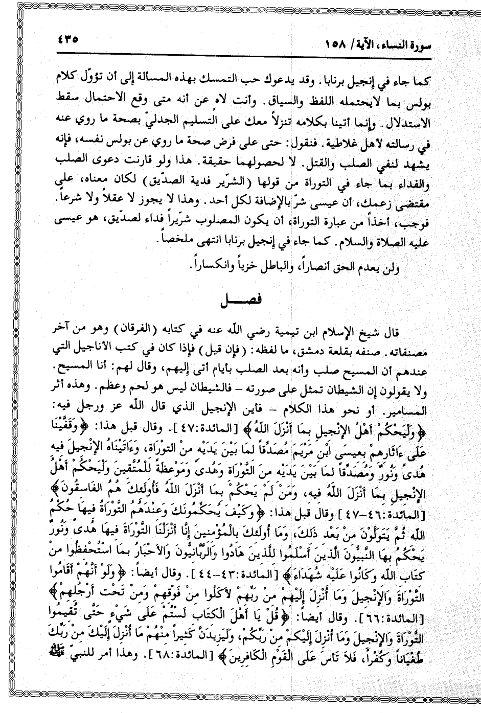 قال شيخ الإسلام ابن تيمية رضي الله عنه في كتابه (الفرقان) وهو من آخر مصنفاته. صنفه بقلعة دمشق، ما لفظه: (فإن قيل) فإذا كان في كتب الأناجيل التي عندهم أن المسيح صلب وأنه بعد الصلب بأيام أتى إليهم، وقال لهم: أنا المسيح.