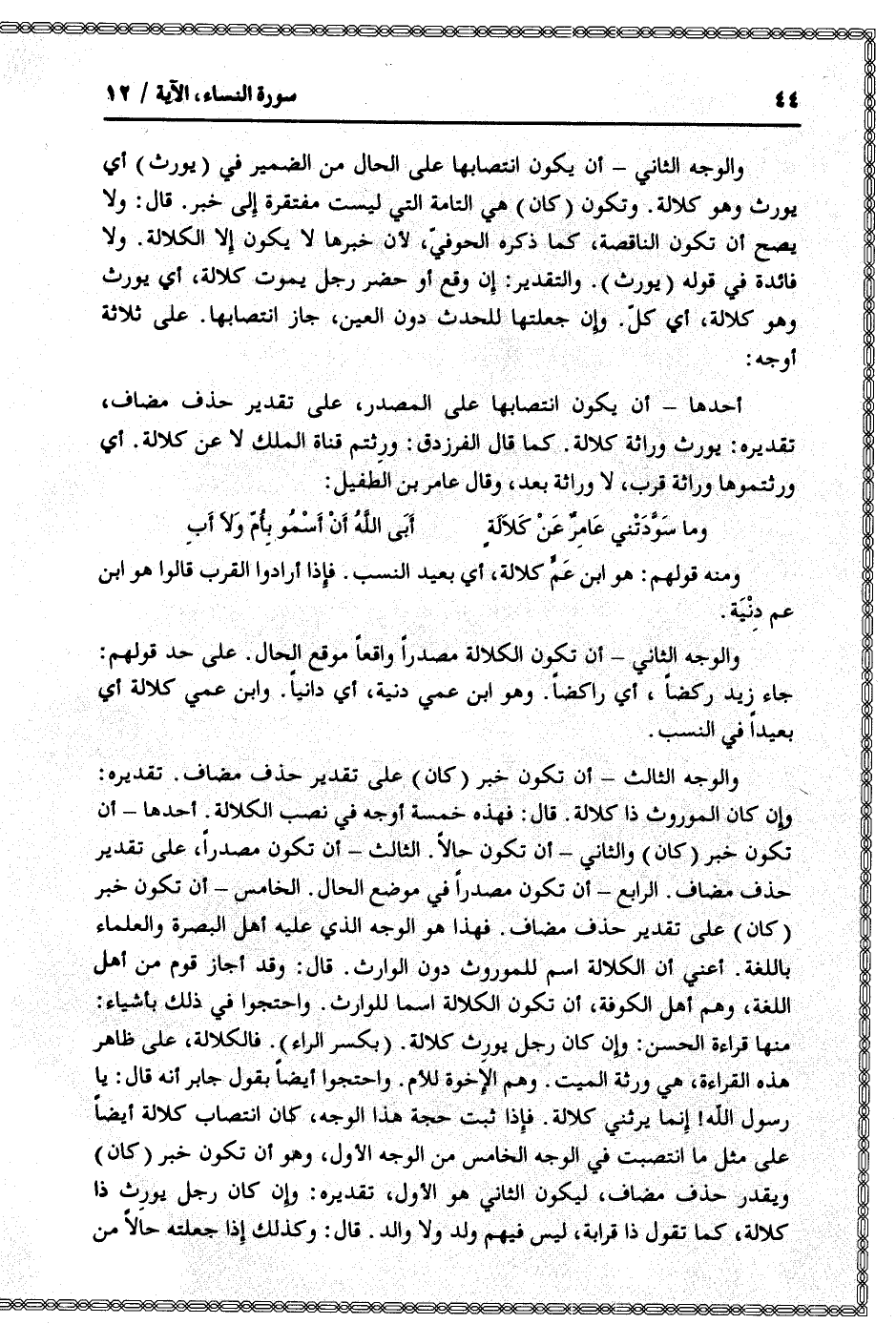 وإن كان الموروث ذا كلالة. قال: فهذه خمسة أوجه في نصب الكلالة. أحدها- أن تكون خبر (كان) والثاني- أن تكون حالا. الثالث- أن تكون مصدرا، على تقدير حذف مضاف. الرابع- أن تكون مصدرا في موضع الحال. الخامس- أن تكون خبر (كان) على تقدير حذف مضاف. فهذا هو الوجه الذي عليه أهل البصرة والعلماء باللغة. أعني أن الكلالة اسم للموروث دون الوارث. قال: وقد أجاز قوم من أهل اللغة، وهم أهل الكوفة، أن تكون الكلالة اسما للوارث. واحتجوا في ذلك بأشياء: